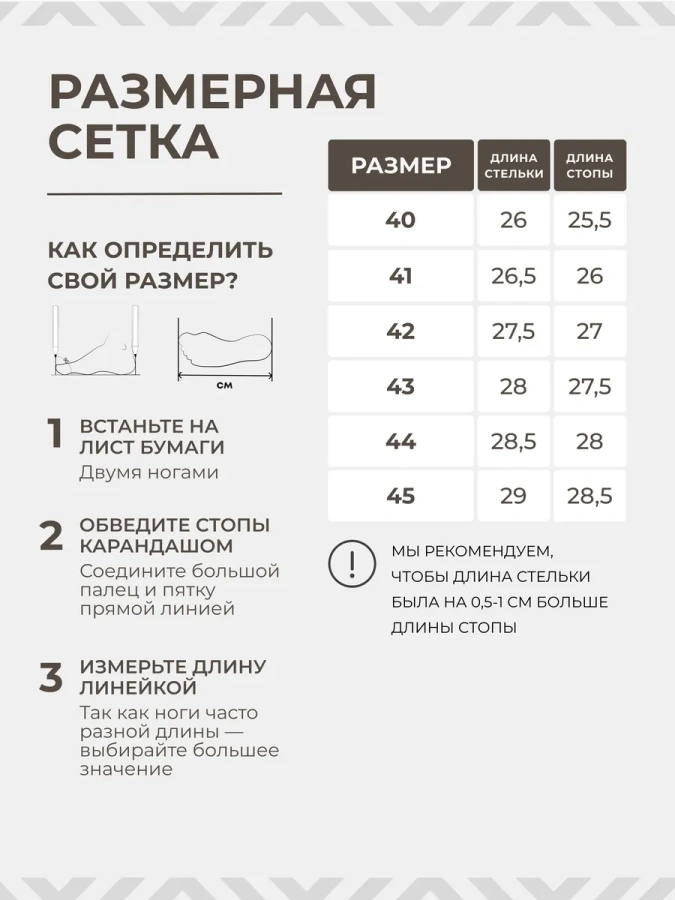 Длина стельки: 40р - 26,0см/ 41р - 26,5см/ 42р - 27,5см/ 43р - 28,0см/ 44р - 28,5см/45р - 29,0см. Полнота G (7) (на стандартную и увеличенную полноту).
