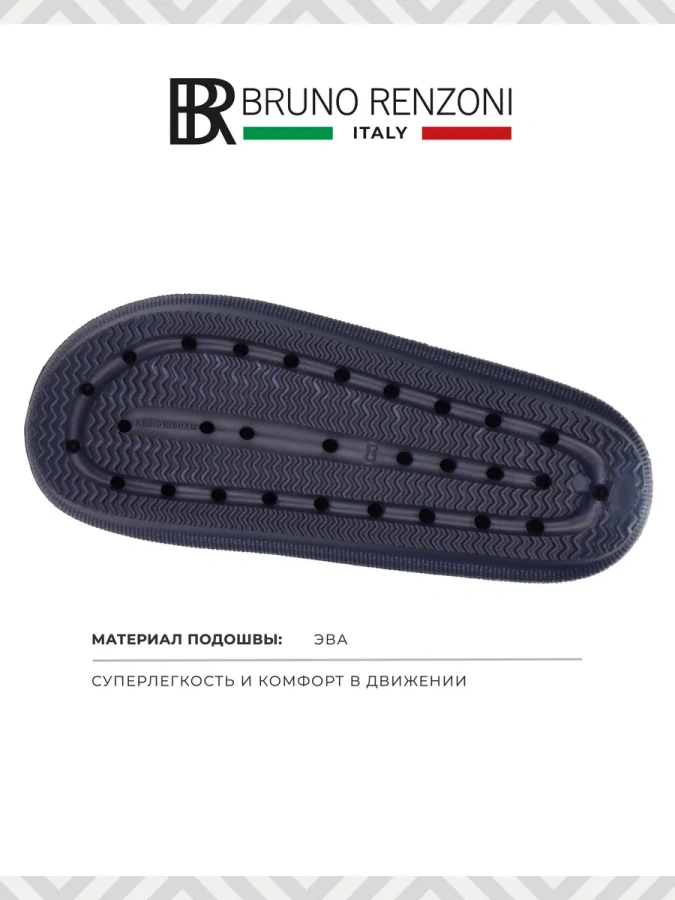 Мужские шлепанцы от итальянского бренда Bruno Renzoni. Длина стельки в см.: 40 - 26/ 41 - 26,5/ 42 - 27/ 43 - 27,5/ 44 - 28,5/ 45 - 29. Высота подошвы в пяточной части - 3,5 см., высота подошвы в носочной части - 2 см. Модель изготовлена из высококачественного композиционного полимерного материал, что повышает прочность изделия и придает максимальный комфорт ноге. Плоская подошва обладает износостойкостью и хорошим сцеплением с поверхностью. Удобная колодка адаптирована под мужскую стопу и длительную носку. Подходят на стандартную полноту стопы и небольшой +/-.