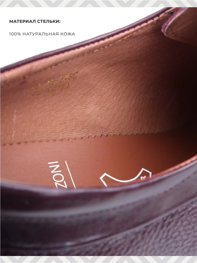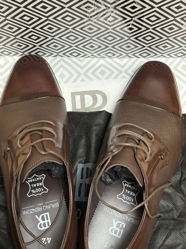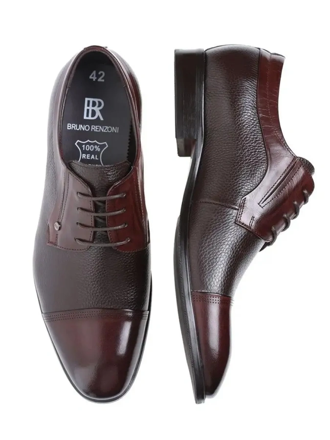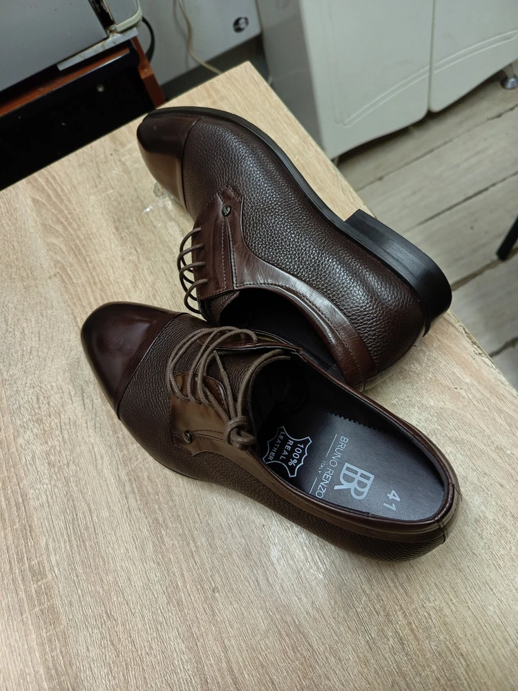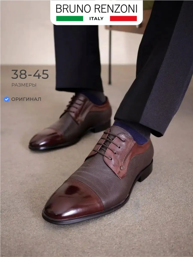 Мужские туфли Дерби из натуральной кожи от итальянского бренда Bruno Renzoni. Длина стельки в см.: 39 - 27/ 40 - 27,5/ 41 - 28,5/ 42 - 29/ 43 - 29,5/ 44 - 30/ 45 - 30,5. Подкладка и несъемная стелька также выполнены из 100% натуральной кожи, что повышает прочность изделия и придает максимальный комфорт ноге. Изюминка модели - сочетание двух типов кожи: гладкой и зернистой. Подошва обладает износостойкостью и хорошим сцеплением с поверхностью. Удобная колодка адаптирована под мужскую стопу и длительную носку. Эластичные вставки по бокам облегчает процесс обувания, а наличие шнуровки позволяет регулировать подъем. Подходят на стандартную полноту стопы и небольшой +/-.