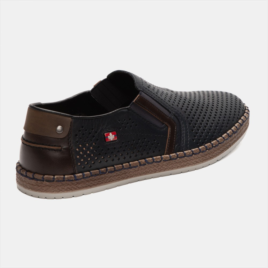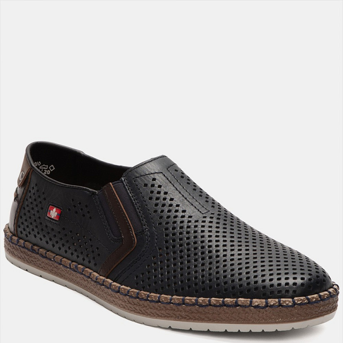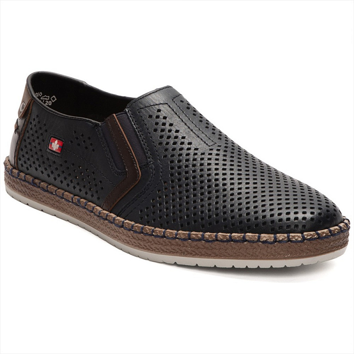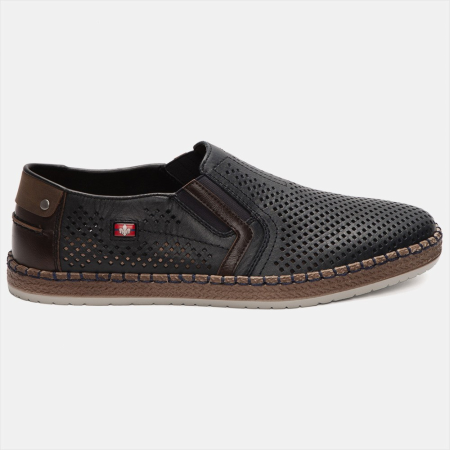 Мужские слипоны RIEKER синего цвета — идеальный выбор для летнего сезона. Изготовлены из 100% натуральной кожи, обеспечивают комфорт и долговечность. Стиль casual делает их подходящими для повседневного ношения. Втачная резинка обеспечивает удобство и лёгкость обувания. Высота подошвы и каблука — 2 см. Материал стельки — 100% натуральная кожа, материал подкладки — искусственный.