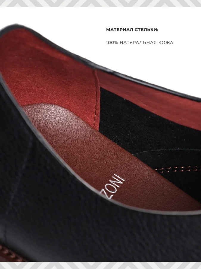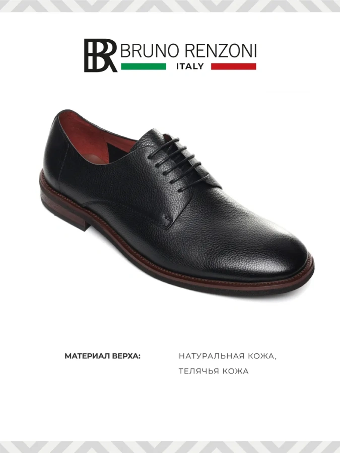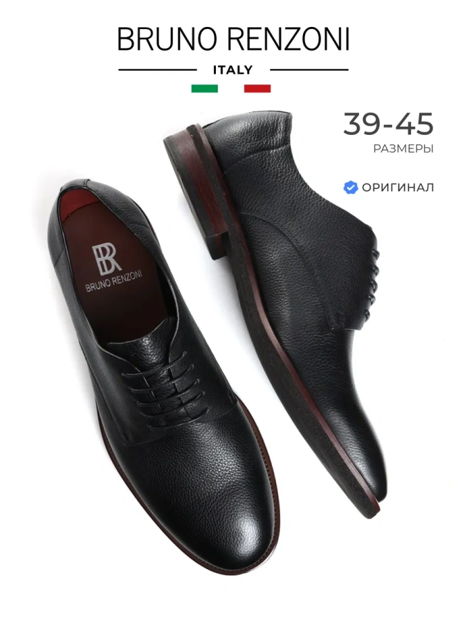 Мужские туфли из натуральной зернистой кожи от итальянского бренда Bruno Renzoni. Длина стельки в см.: 39 - 26,5 / 40 - 27 / 41 - 27,5 / 42 - 28 / 43 - 28,5 / 44 - 29 / 45 - 30. Высота каблука – 3 см., высота подошвы в носочной части - 1 см., высота задника – 7,5 см. Туфли изготовлены из бесподкладочной кожи, она тоньше и эластичнее, чем в изделиях с подкладкой, однако прочная и обладает повышенным воздухообменном. Несъемная стелька также выполнена из натуральной кожи, что повышает прочность изделия и придает максимальный комфорт ноге. Классическая подошва обладает износостойкостью и хорошим сцеплением с поверхностью. Удобная колодка адаптирована под мужскую стопу и длительную носку, а наличие шнуровки обеспечивает комфортную посадку на ноге. Подходят на стандартную полноту стопы и небольшой +/-.