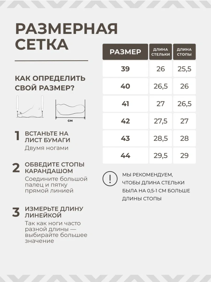 Длина стельки: 39р-26см/40р-26,5см/41р-27см/42р-27,5см/43р-28см/44р-28,5 см Полнота F (6) стандарт