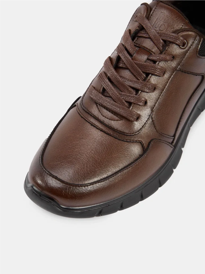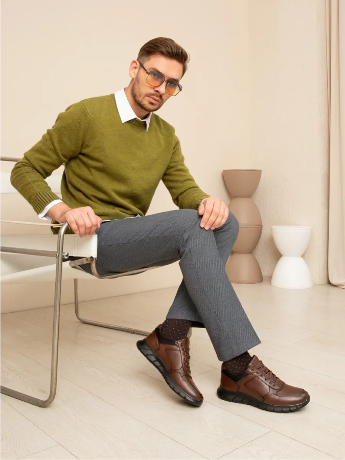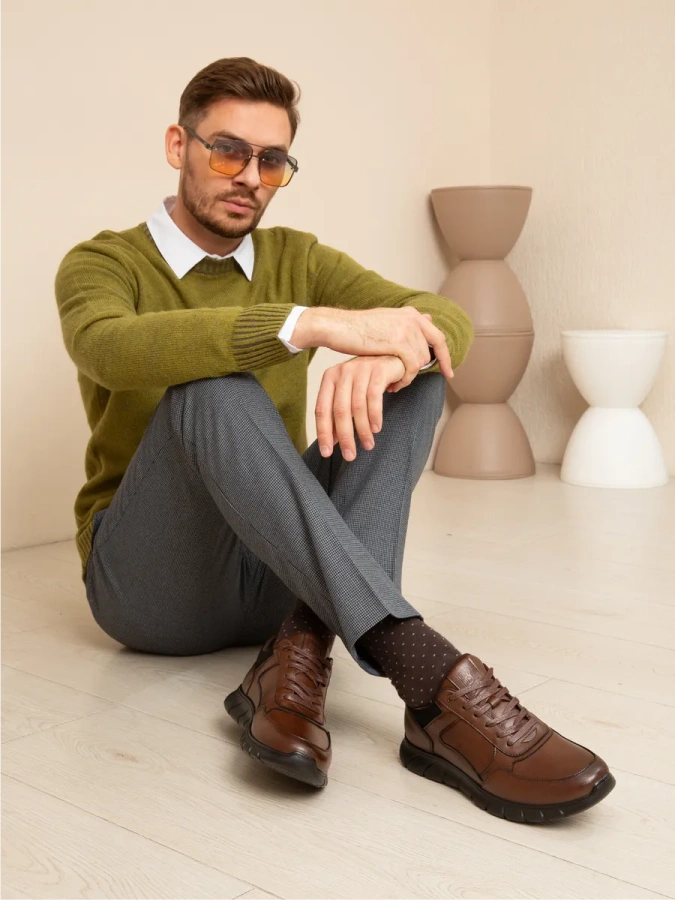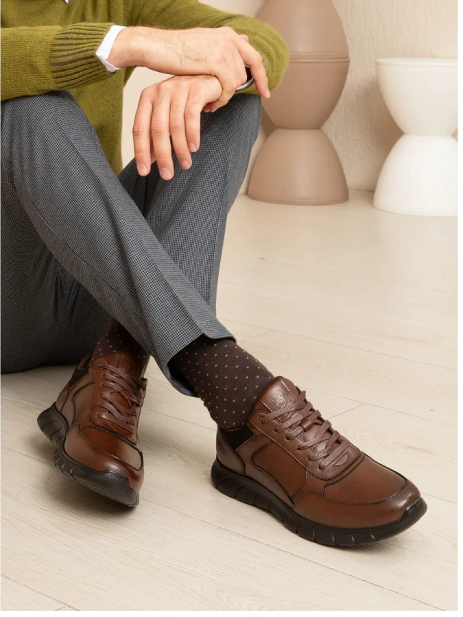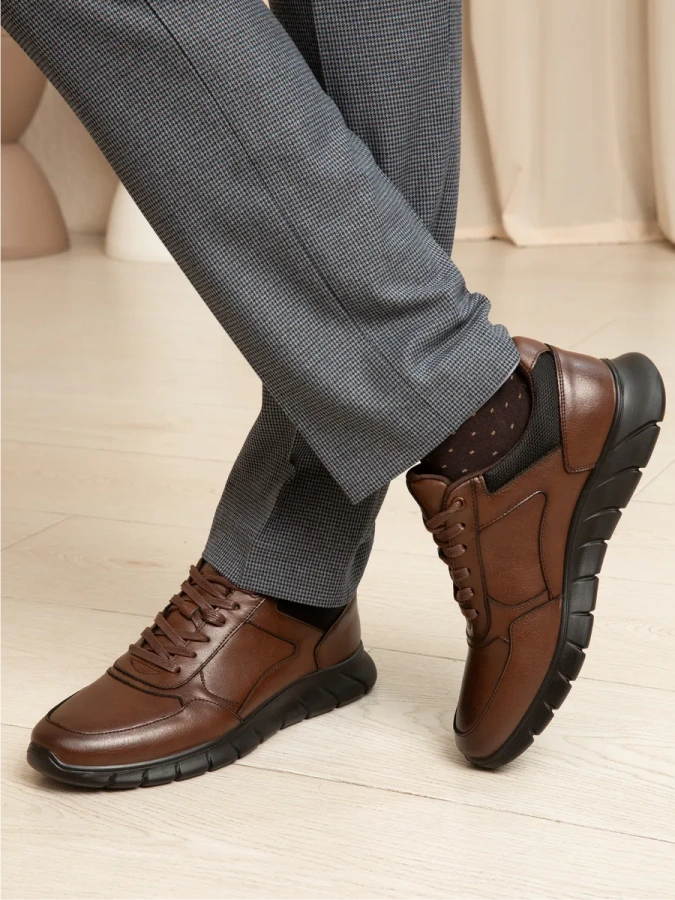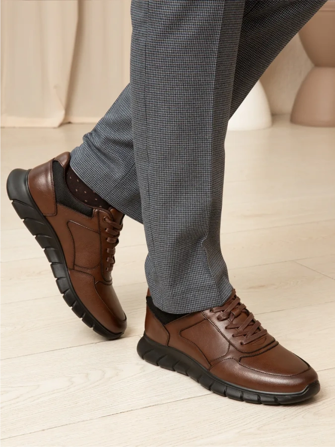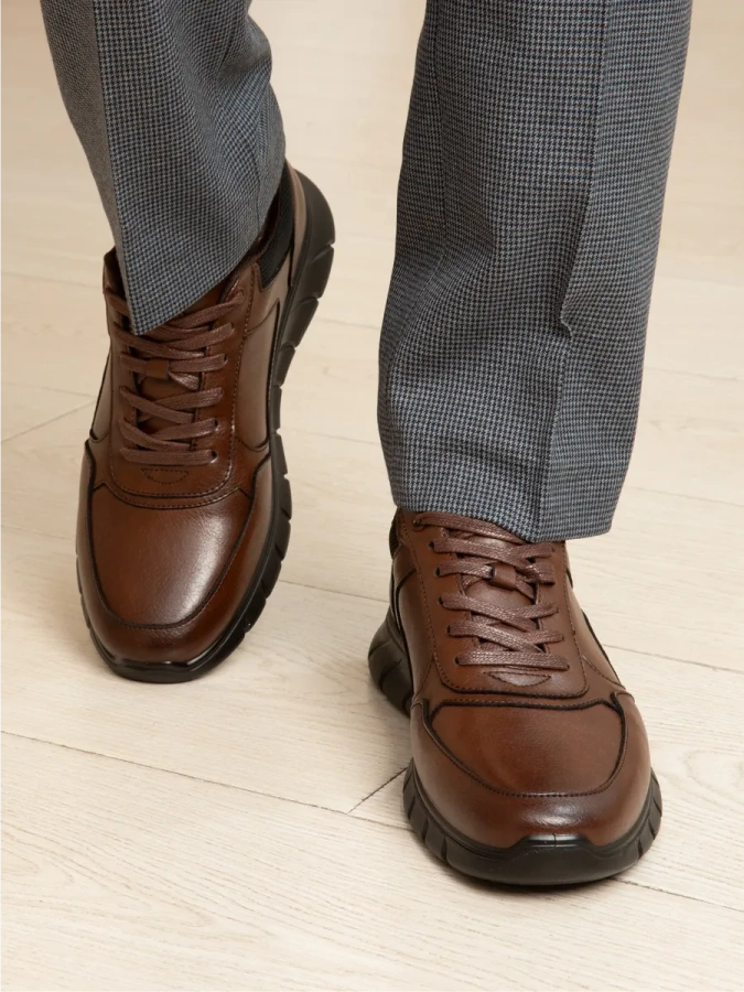 Модель изготовлена из 100% натуральной кожи, что придаёт ей изысканный и долговечный вид. Кроссовки в коричневом цвете станут отличным дополнением к вашему гардеробу и подойдут для любого образа. Мягкая текстильная подкладка и стелька из натуральной кожи обеспечивают комфорт при ходьбе, а подошва из полимера гарантирует хорошую амортизацию и износостойкость. Удобная шнуровка позволяет регулировать посадку обуви по своему усмотрению. Высота подошвы — всего 1 см, а высота каблука — 3,5 см, что обеспечивает удобство и устойчивость. Эти кроссовки идеальный выбор для активных мужчин, ценящих стиль и качество.