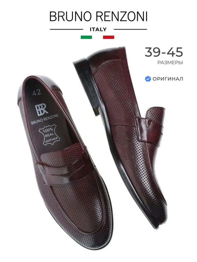 Классические мужские туфли Лоферы из натуральной кожи от итальянского бренда Bruno Renzoni. Длина стельки в см.: 39 - 27/ 40 - 27,5/ 41 - 28/ 42 - 28,5/ 43 - 29/ 44 - 29,5/ 45 - 30. Подкладка и несъемная стелька также выполнены из натуральной кожи, что повышает прочность изделия и придает максимальный комфорт ноге. Сквозная перфорация обеспечивает естественную вентиляцию стопы. Эластичные выставки облегчают процесс обувания. Удобная колодка адаптирована под мужскую стопу и длительную носку. Подходят на стандартную полноту стопы и небольшой +/-.