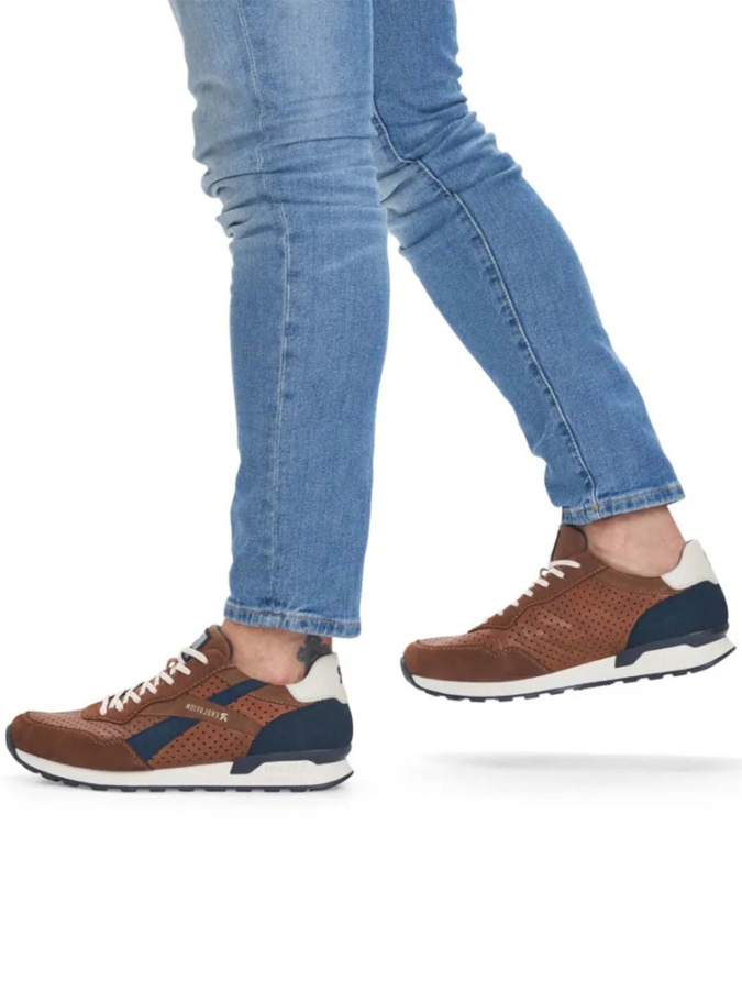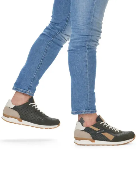 Мужские кроссовки из натуральной кожи от бренда Rieker. Главная отличительная черта обуви этого бренда - непревзойденное удобство и комфорт. Идеально подойдут на весну и не жаркое лето. Перфорация несквозная. Подкладка из текстиля устойчива к износу и хорошо вентилируются. Анатомическая текстильная стелька с технологией Evolution Soft обладает эффектом памяти и дополнительным супинатором в пяточной части, что придает особый комфорт стопе. Рельефная подошва с эффектом ударопоглощения обладает износостойкостью, повышенной амортизацией и хорошим сцеплением с поверхностью. Удобная широкая колодка обуви адаптирована под мужскую стопу и длительную носку, а наличие шнуровки позволяет регулировать подъем. Подходят на стандартную полноту стопы и выше.