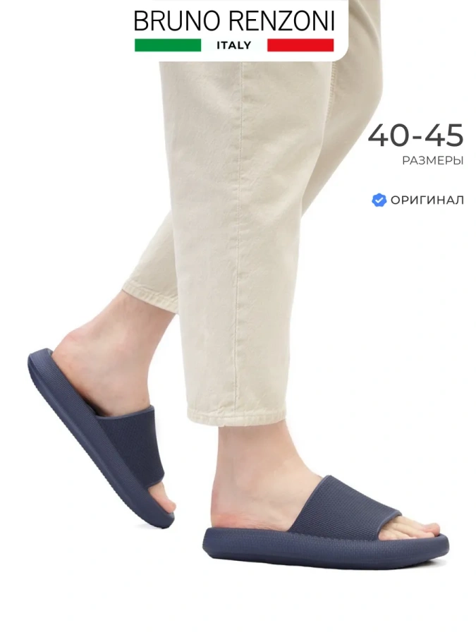 Мужские шлепанцы от итальянского бренда Bruno Renzoni. Длина стельки в см.: 40 - 26/ 41 - 26,5/ 42 - 27/ 43 - 27,5/ 44 - 28,5/ 45 - 29. Высота подошвы в пяточной части - 3,5 см., высота подошвы в носочной части - 2 см. Модель изготовлена из высококачественного композиционного полимерного материал, что повышает прочность изделия и придает максимальный комфорт ноге. Плоская подошва обладает износостойкостью и хорошим сцеплением с поверхностью. Удобная колодка адаптирована под мужскую стопу и длительную носку. Подходят на стандартную полноту стопы и небольшой +/-.