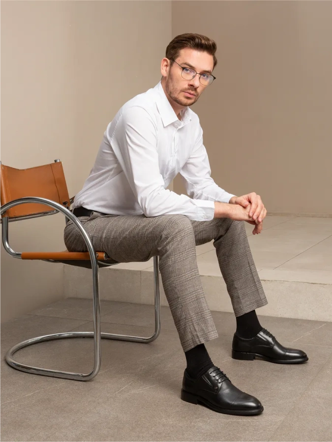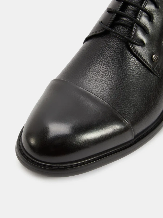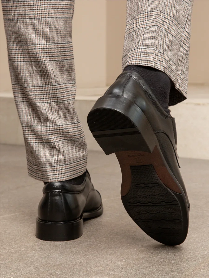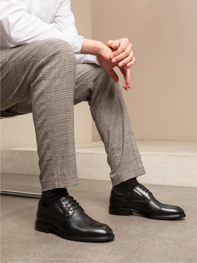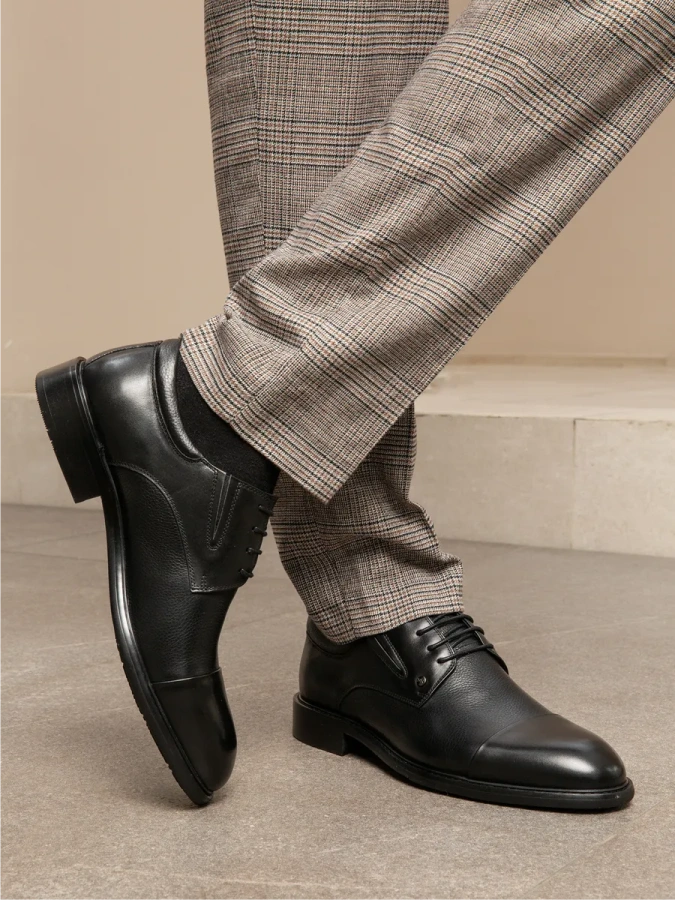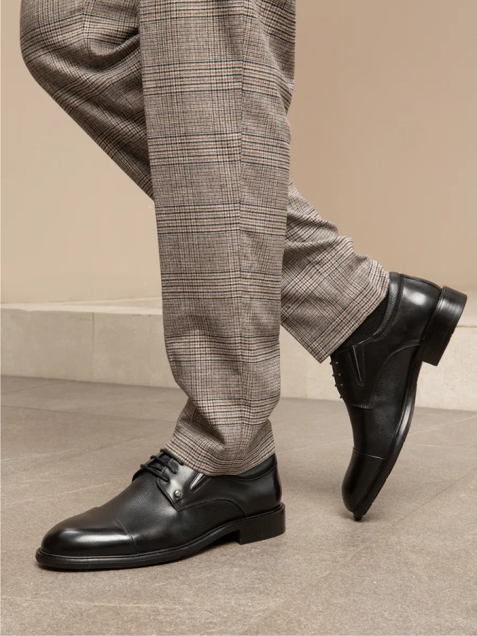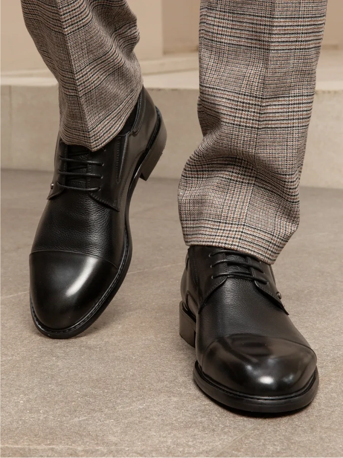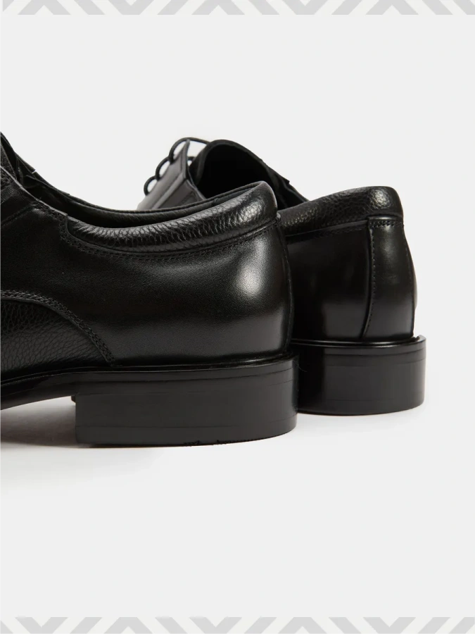 Модель изготовлена из 100% натуральной кожи, которая придаёт туфлям изысканный и благородный вид. Эти чёрные мужские туфли — настоящее воплощение стиля и комфорта для осеннего сезона. Они станут отличным дополнением к повседневному образу, добавляя ему элегантности. Высота подошвы всего 1 см, а высота каблука — 3 см, что обеспечивает удобство и устойчивость. Регулируемая шнуровка позволяет настроить посадку туфли по своему усмотрению.