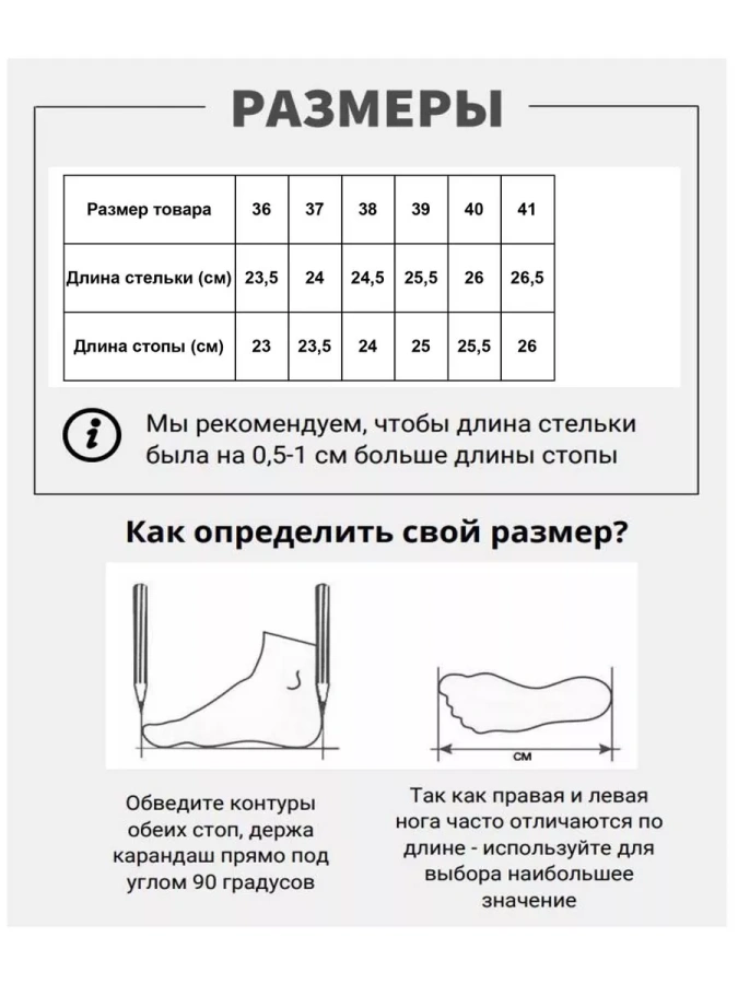Длина стельки: 36р - 23,5см/ 37р - 24,0см/ 38р - 24,5см/ 39р - 25,5см/40р - 26,0см/41р - 26,5см. Полнота F(6) (на узкую полноту стопы).