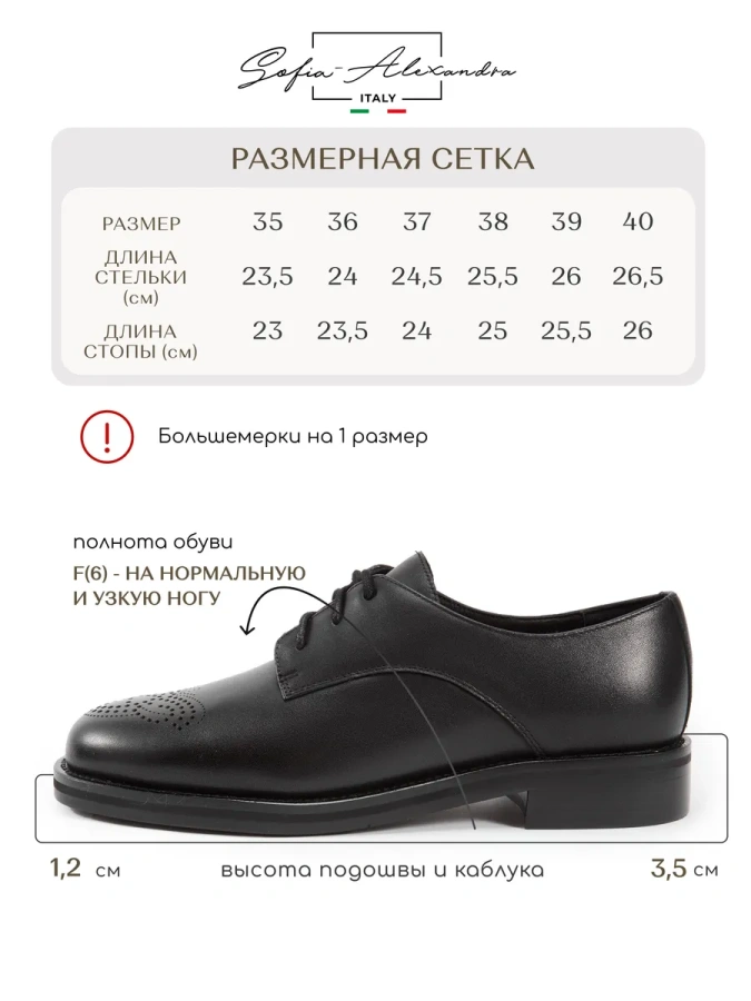 Длина стельки: 35р - 23,5см/ 36р - 24,0см/ 37р - 24,5см/ 38р - 25,5см/ 39р - 26,0см/40р - 26,5см. Полнота F(6) (на узкую полноту стопы).