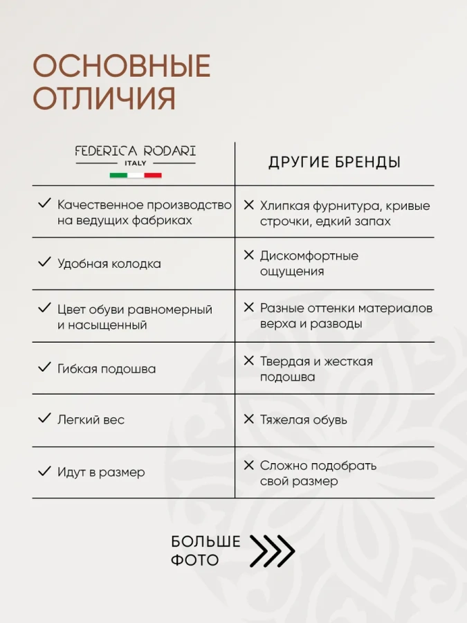 Federica Rodari — премиальная женская обувь от итальянских дизайнеров. Модели из натуральной телячьей кожи высшего сорта отличаются прочностью и устойчивостью к внешним воздействиям. Колодки адаптированы под форму стопы, обеспечивая удобство при ходьбе. Обувь изготавливается по европейским стандартам на итальянском оборудовании с контролем качества. Летние модели с открытым носом и на каблуке подчеркнут индивидуальность и подойдут для офиса, деловых встреч, школы или выпускного. Стильные сабо — идеальный вариант для вечеринок или свадьбы. Обувь обеспечивает комфорт и естественную вентиляцию стопы благодаря подкладкам и стелькам из натуральной кожи.