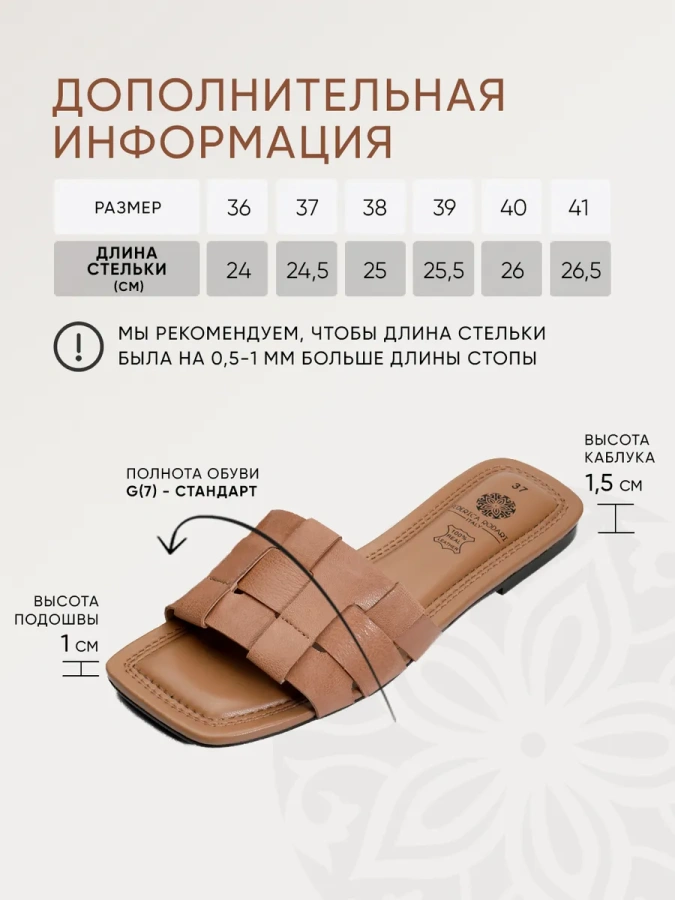 Длина стельки: 36р - 24,0см/ 37р - 24,5см/ 38р - 25,0см/ 39р - 25,5см/40р - 26,0см/41р - 26,5см. Полнота G (7) (на стандартную и увеличенную полноту).