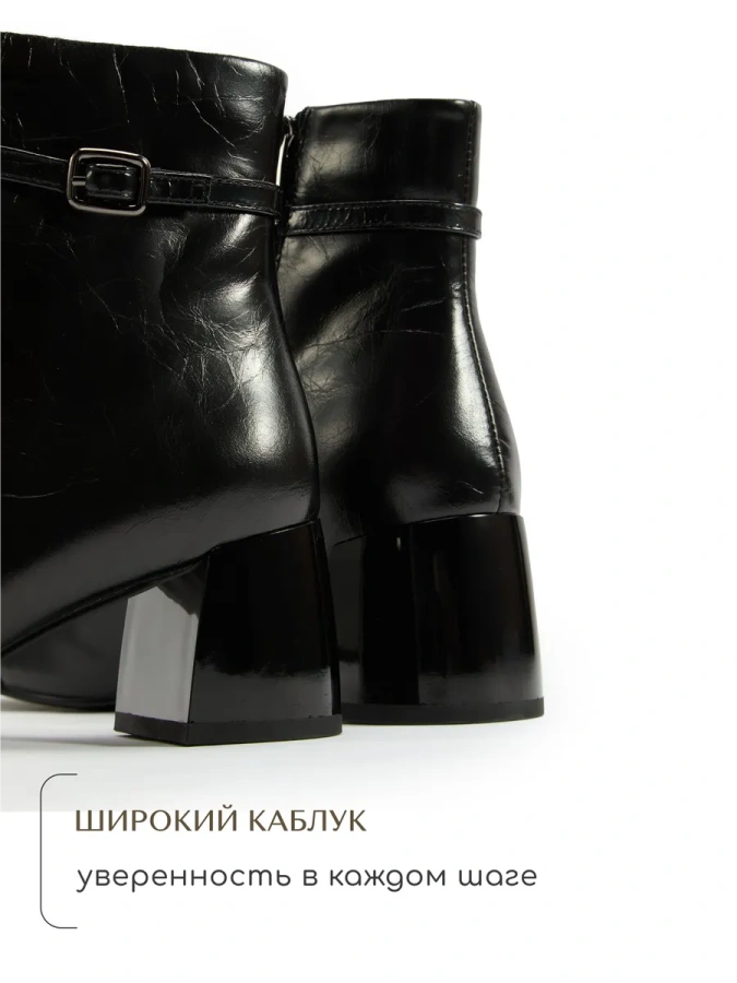 Выполнены из 100% натуральной кожи чёрного цвета и отличаются удобным и стильным дизайном в стиле casual.Высота подошвы всего 0,5 см, а каблук — 6 см трапециевидной формы. Благодаря молнии с внутренней стороны модели, надевать ботильоны легко и удобно. Мягкая байковая подкладка и стелька обеспечивают комфорт при носке. Эти ботильоны станут отличным дополнением к вашему осеннему гардеробу и подчеркнут ваш неповторимый стиль.