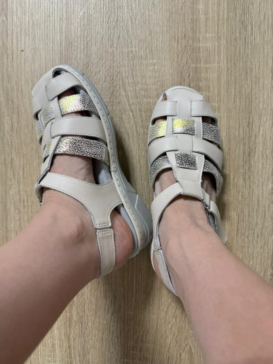 Они выполнены из 100% натуральной кожи молочного цвета, что придаёт им изысканный и утончённый вид. Удобная танкетка высотой 4,5 см и платформа в 2 см обеспечивают комфорт и стильный образ в стиле casual. Липучка как тип застёжки делает сандалии практичными в использовании. Эти сандалии станут отличным дополнением к вашему гардеробу и подойдут для прогулок и повседневных образов.Cъёмная стелька обеспечивает комфорт, поддержку и гигиену обуви. её можно заменить, постирать или высушить, продлевая срок службы обуви