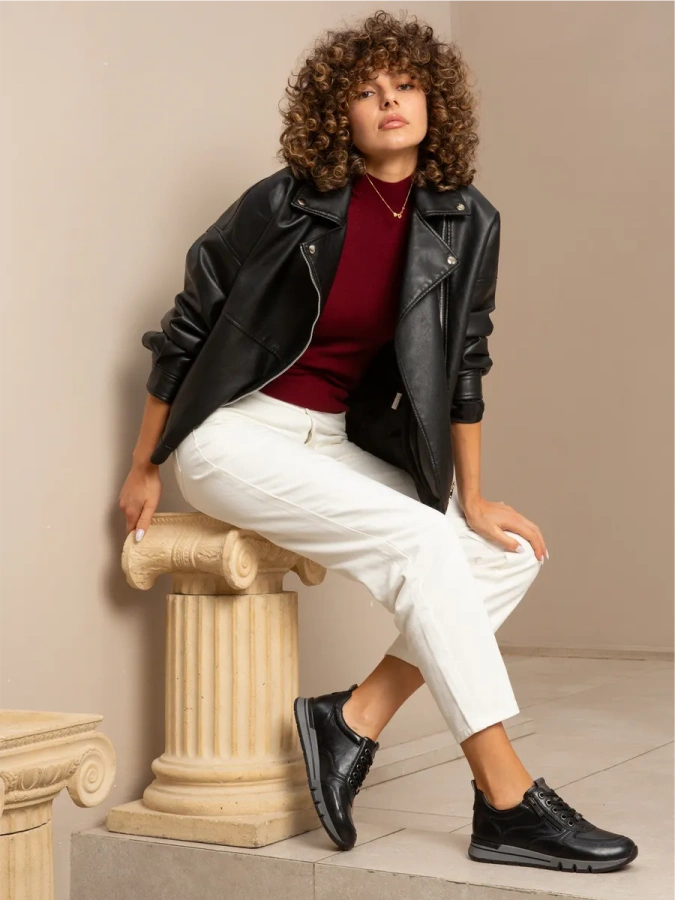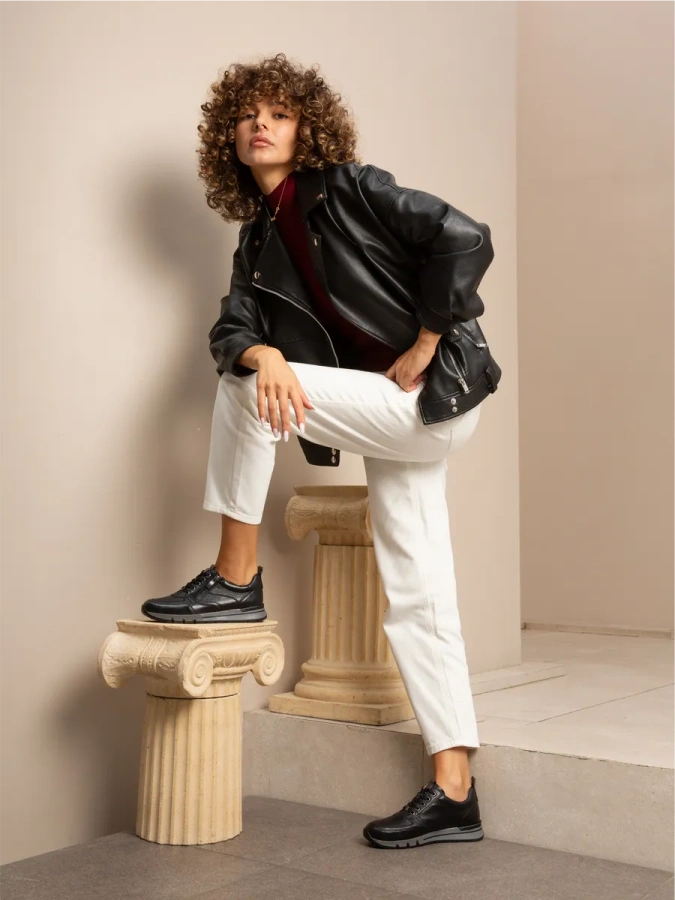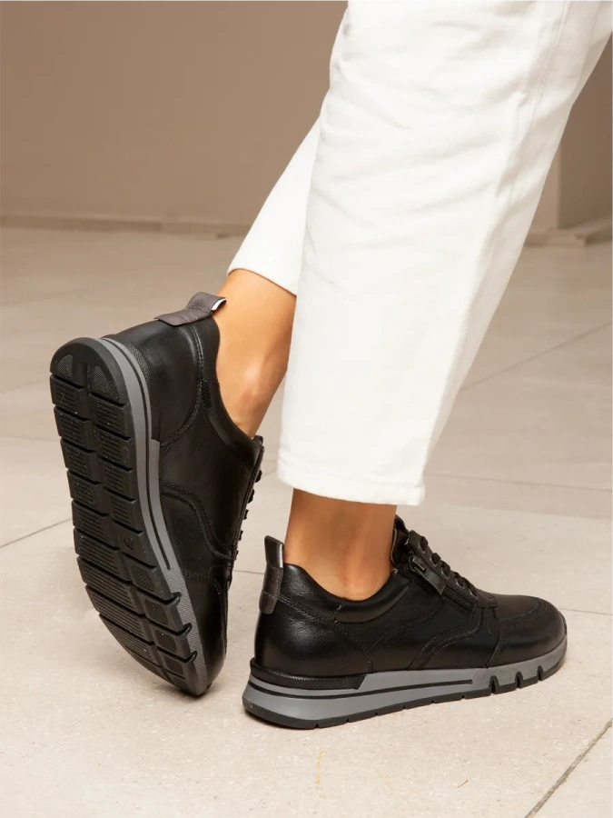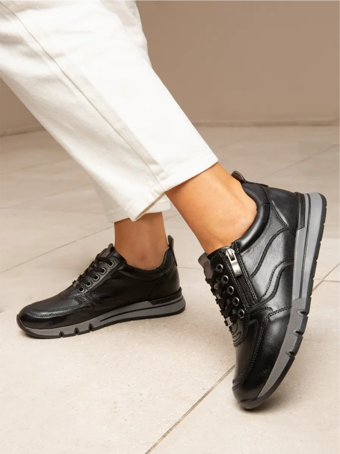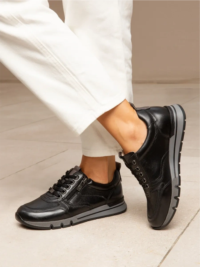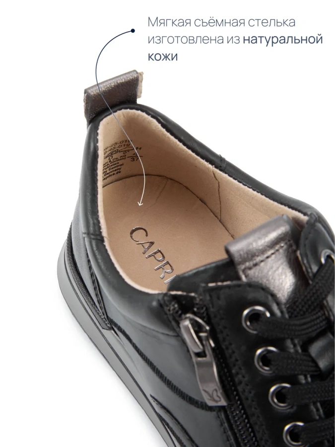 Модель изготовлена из 100% натуральной кожи, что обеспечивает комфорт и долговечность. Чёрные женские кроссовки CAPRICE — это стиль и удобство в каждой детали. Лёгкая полимерная подошва высотой 1 см и платформа создают идеальный баланс, а высота каблука 3,5 см придаёт обуви изящество. Шнуровка и молния обеспечивают надёжную фиксацию стопы, а подкладка из искусственной кожи добавляет практичности. Эти кроссовки идеально подойдут для любого сезона и станут отличным дополнением к вашему гардеробу.