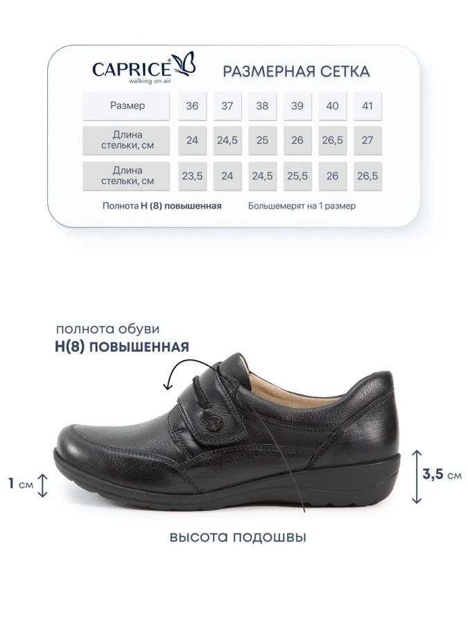 Длина стельки: 36р - 24,0см/ 37р - 24,5см/ 38р - 25,0см/ 39р - 26,0см/40р - 26,5см/41р - 27,0см. Полнота H (8) (увеличенная)