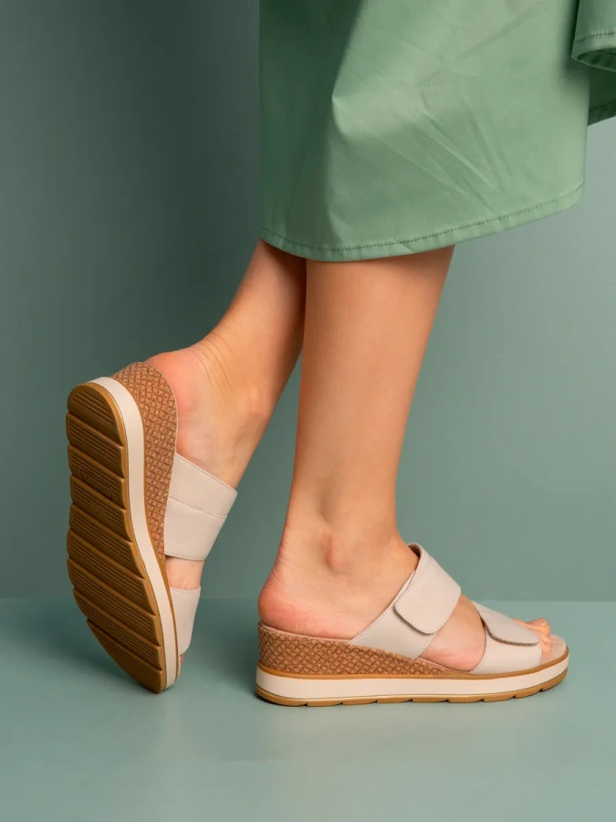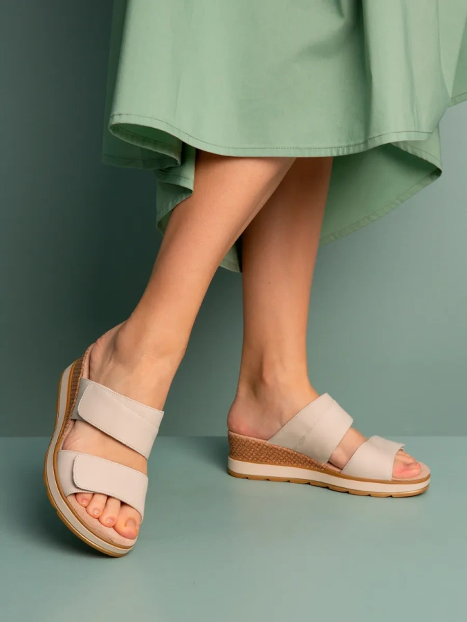 Верх этих сабо изготовлен из натуральной кожи в бежевом цвете. Оснащены удобным ремешком с застежкой на липучке, которая обеспечивает комфортную фиксацию на ноге. Верхняя часть подошвы выполнена из мягкого текстиля, что придаёт дополнительный комфорт и прекрасно подойдут на лето. Открытый мысок и пятка обеспечивают постоянный доступ воздуха. Благодаря лаконичному дизайну и нейтральной расцветке обувь можно комбинировать с вещами разных фасонов. Легкие, мягкие сабо понравятся девушкам, которые много времени проводят на ногах. Это отличный вариант спецобуви для парикмахеров, поваров, медицинских сестер, стоматологов.