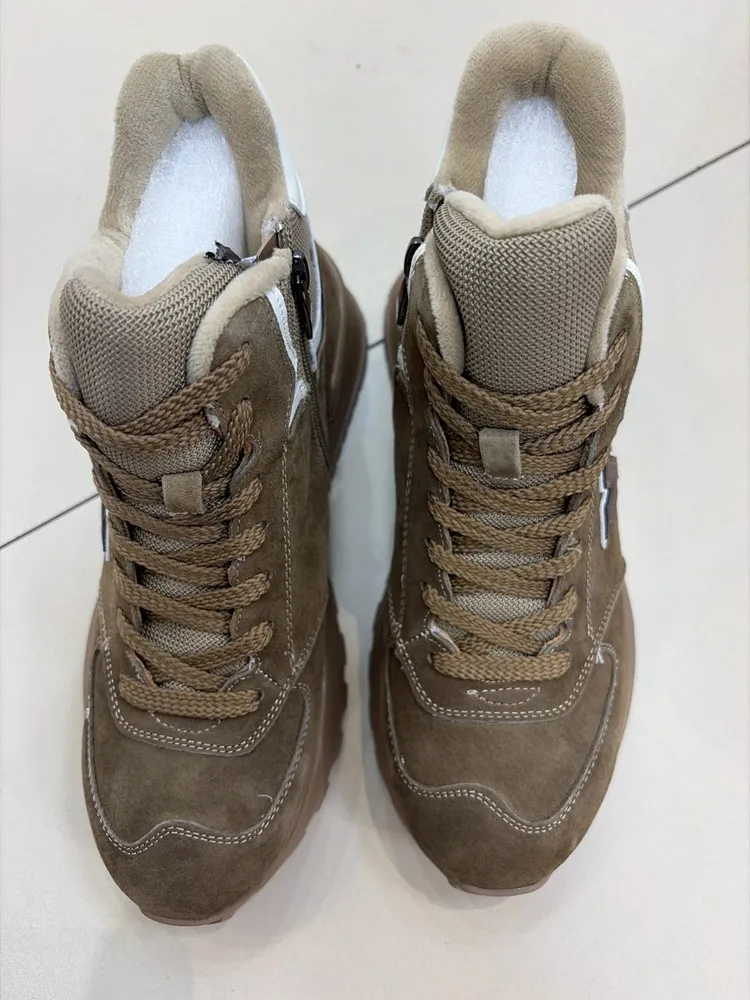 Удобная шнуровка в сочетании с молнией гарантирует надёжную фиксацию стопы. Высота подошвы в 2 см и каблук высотой 4,5 см делают эти кроссовки не только стильными, но и удобными для повседневной носки.