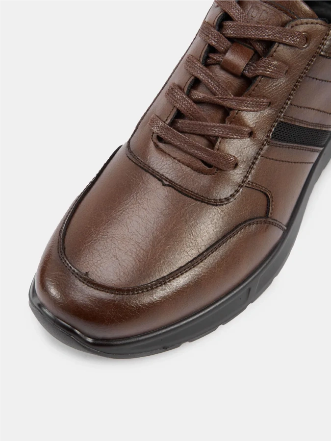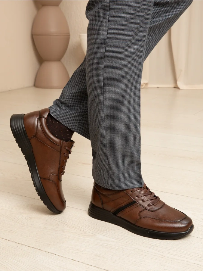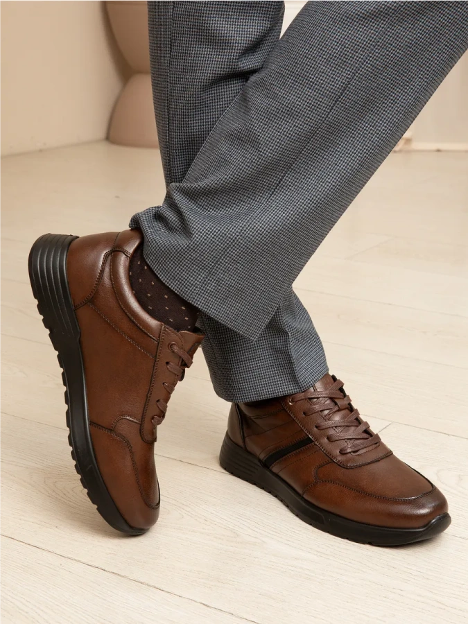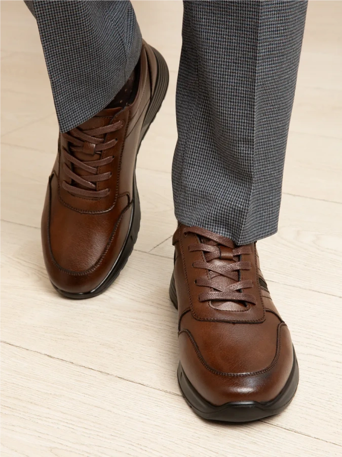 Модель изготовлена из 100% натуральной кожи, что обеспечивает её долговечность и изысканный внешний вид. Коричневый цвет кроссовок станет отличным дополнением к вашему образу в стиле спорт. Текстильная подкладка и стелька из натуральной кожи создают комфорт при носке. Лёгкая и прочная подошва из полимера гарантирует хорошую амортизацию и устойчивость. Высота подошвы — 1,5 см, высота каблука — 3,5 см. Кроссовки идеально подойдут для повседневной носки в любое время года. Удобная шнуровка позволяет регулировать посадку обуви по своему усмотрению.