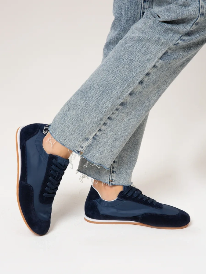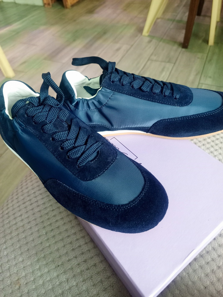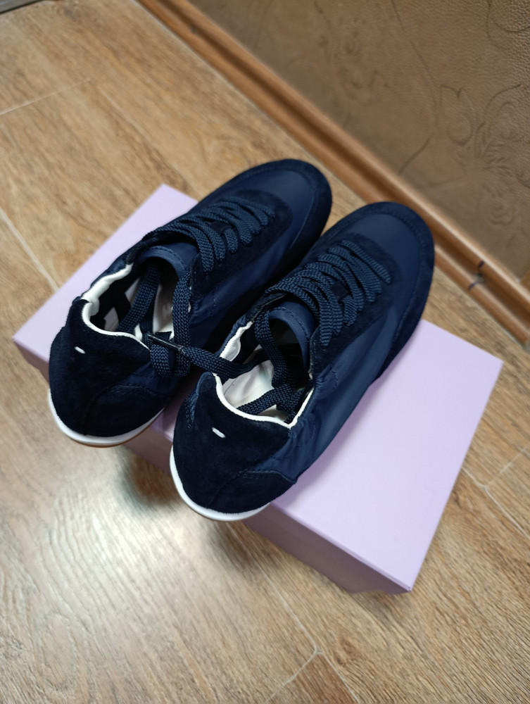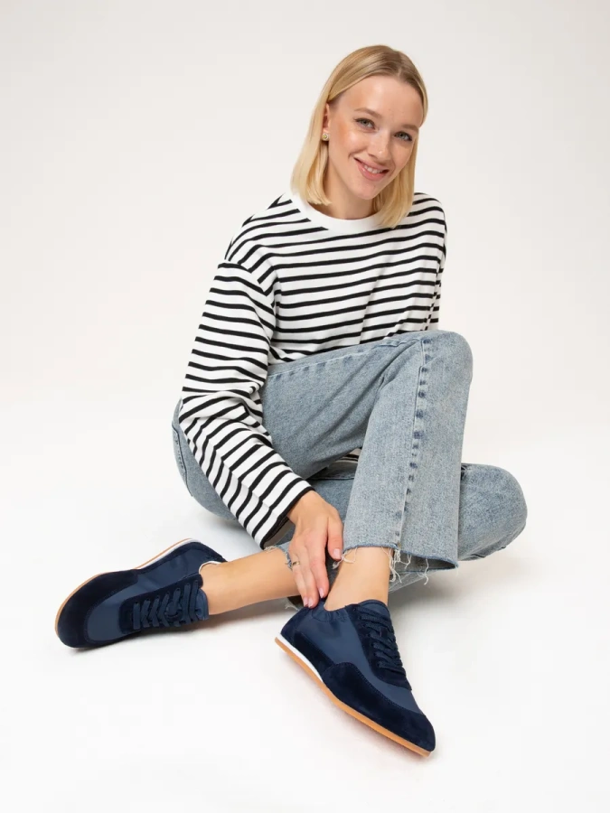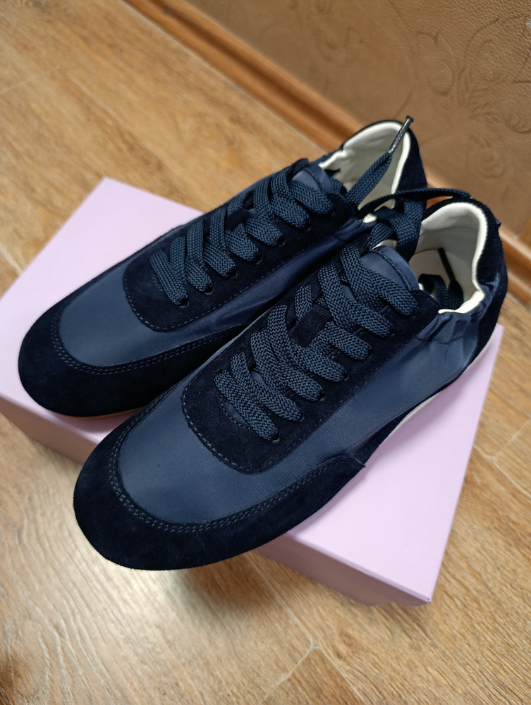 Верх кроссовок выполнен из замши и текстиля, что придаёт им особый шарм и обеспечивает комфорт в носке. Подкладка и стелька из 100% натуральной кожи гарантируют удобство и долговечность. Резиновая подошва обеспечивает отличное сцепление с поверхностью и износостойкость. Шнуровка позволяет регулировать плотность посадки, а минималистичный дизайн без каблука делает эти кроссовки универсальным решением для любого образа в стиле sport. Высота подошвы всего 0,7 см, а высота каблука — 1 см, что обеспечивает удобство и устойчивость при ходьбе.