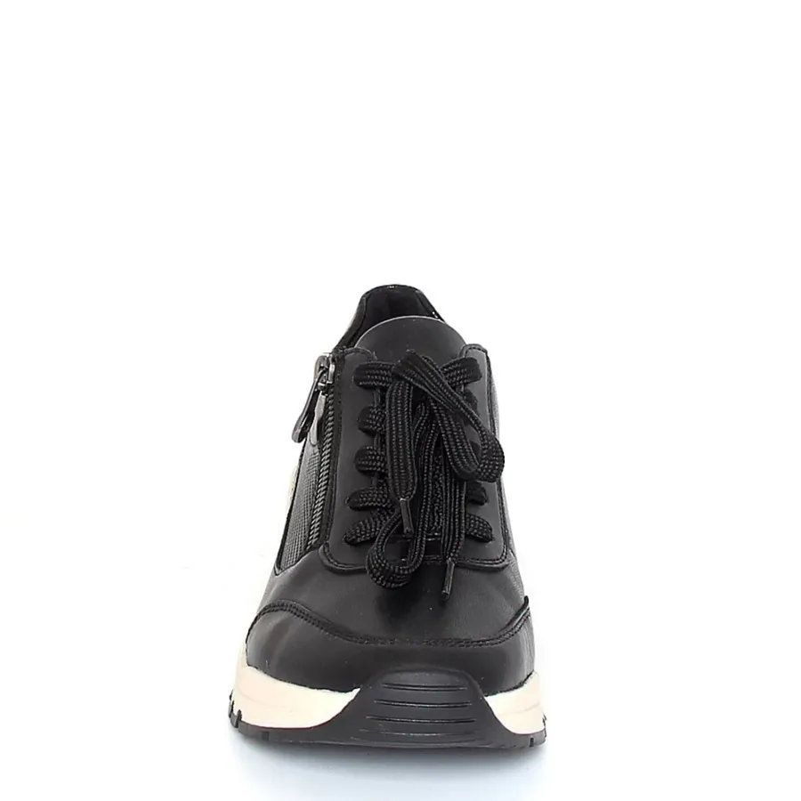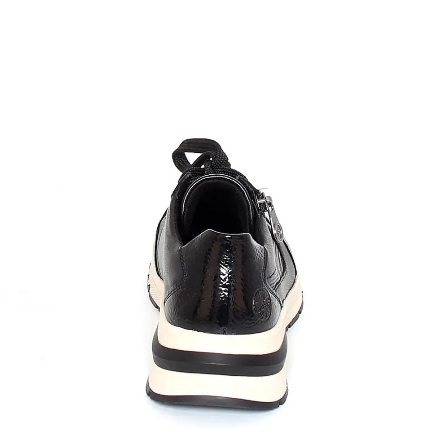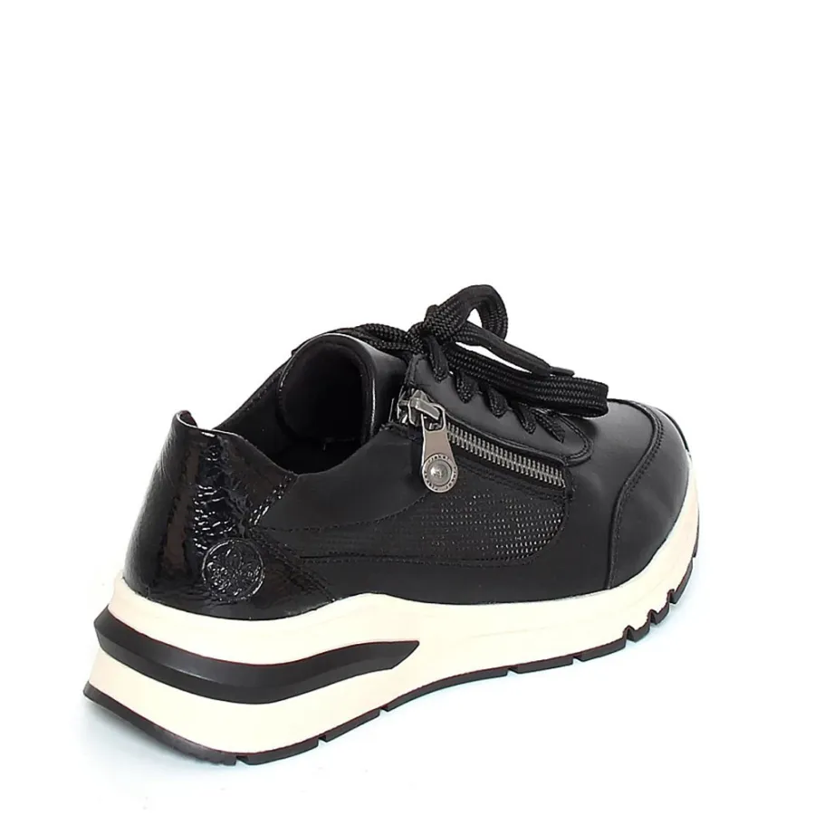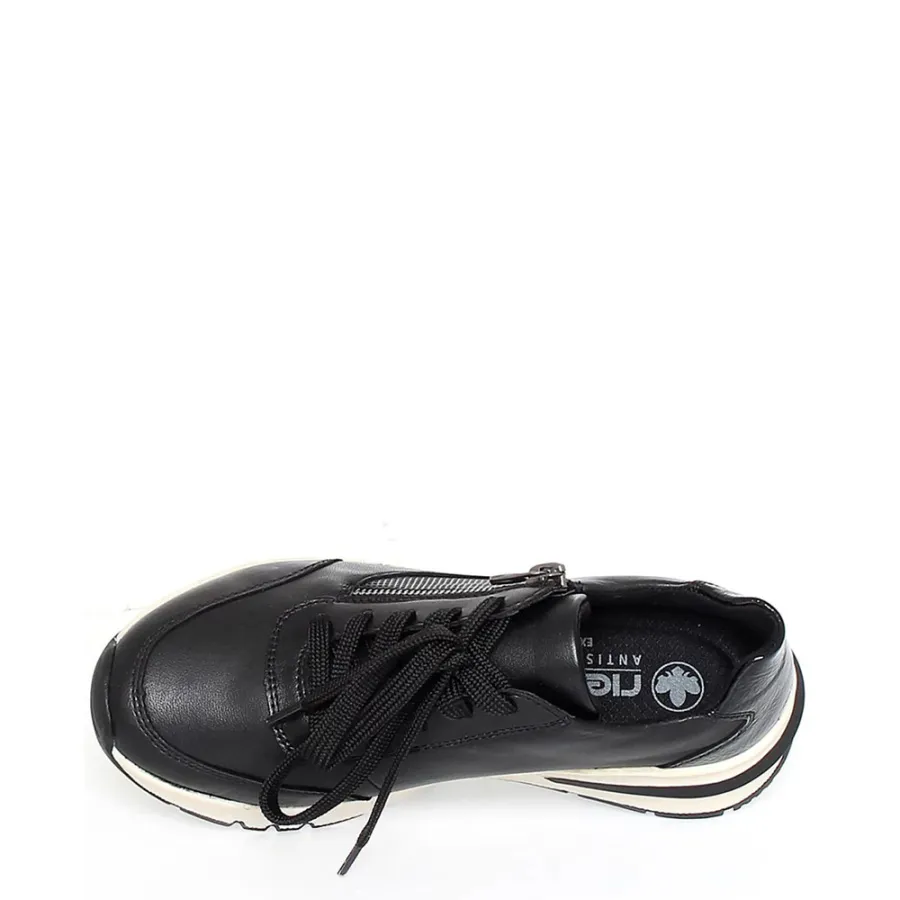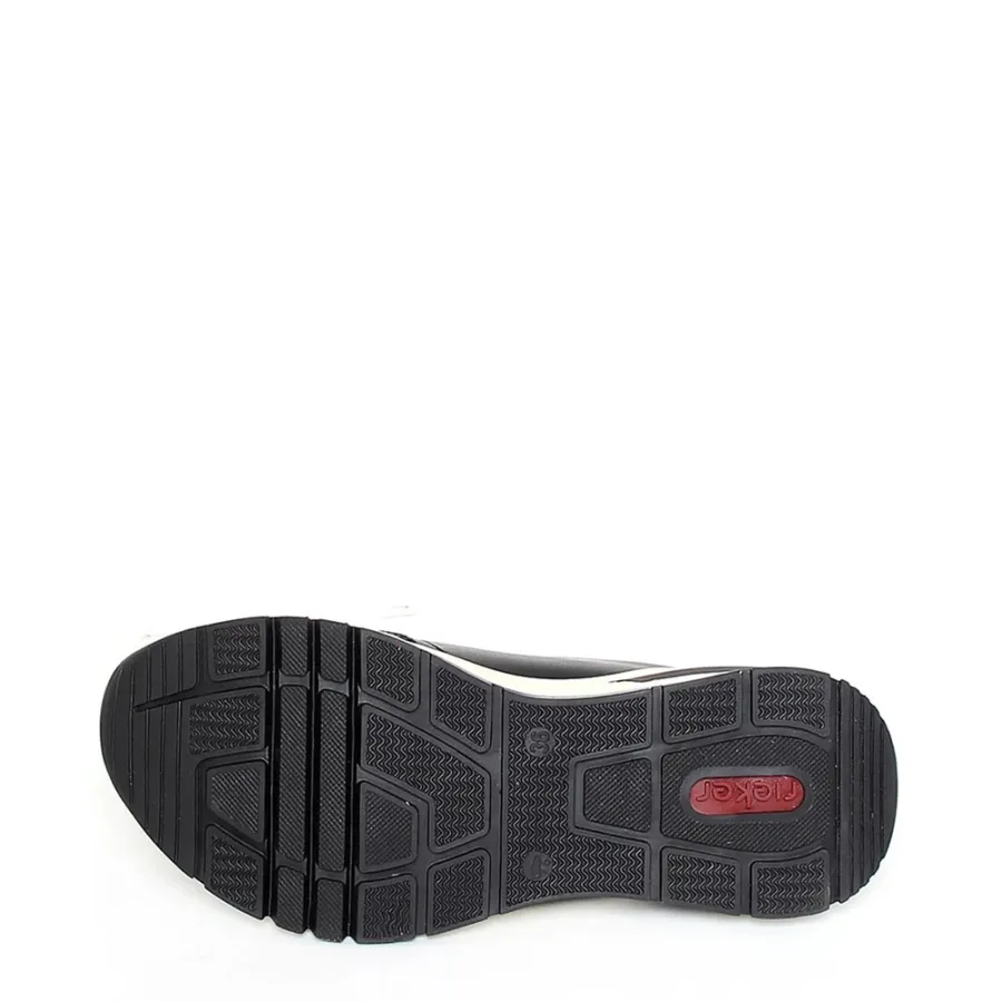 Чёрный цвет и высококачественная натуральная кожа делают их не только удобными, но и стильными. Осенняя коллекция 2025–2026 года порадует вас не только актуальным дизайном, но и высоким качеством материалов. Резиновая подошва обеспечивает отличное сцепление с поверхностью, а высота подошвы в 2 см и танкетка высотой 3 см делают модель удобной и комфортной для длительной носки. Шнуровка в сочетании с молнией обеспечивает надёжную фиксацию стопы. Кроссовки RIEKER — это сочетание стиля, качества и комфорта.