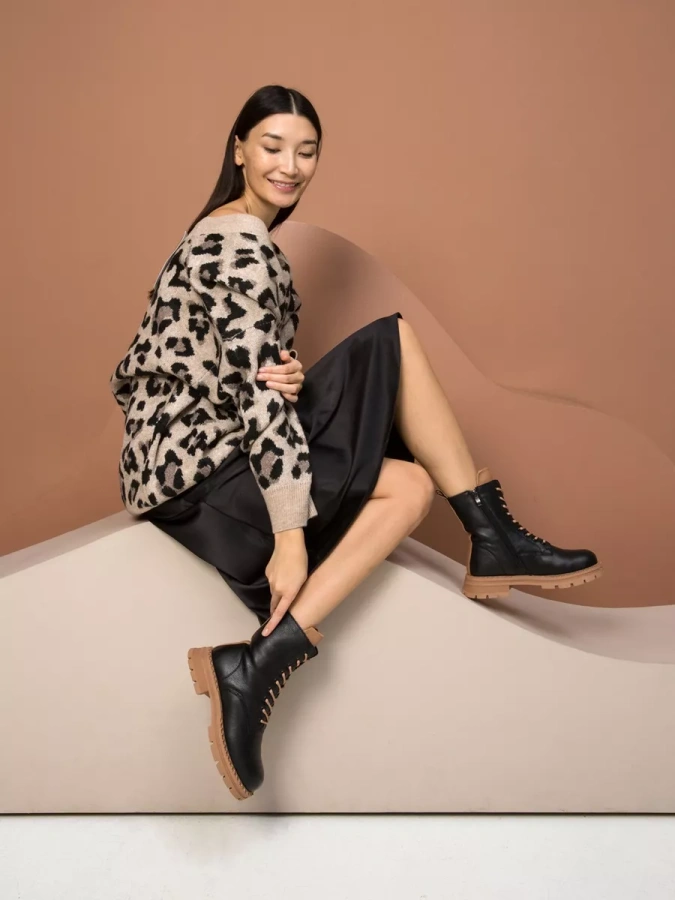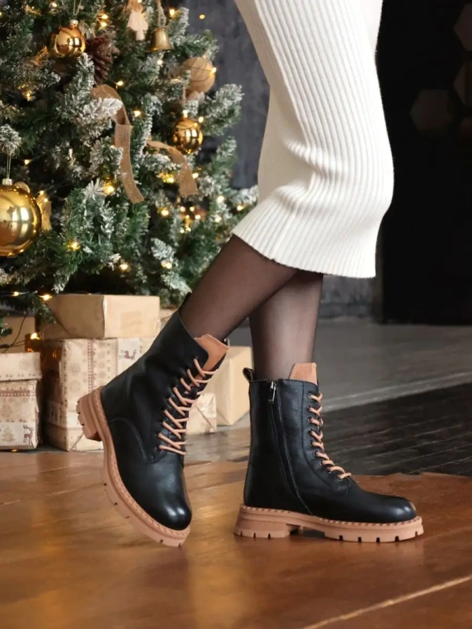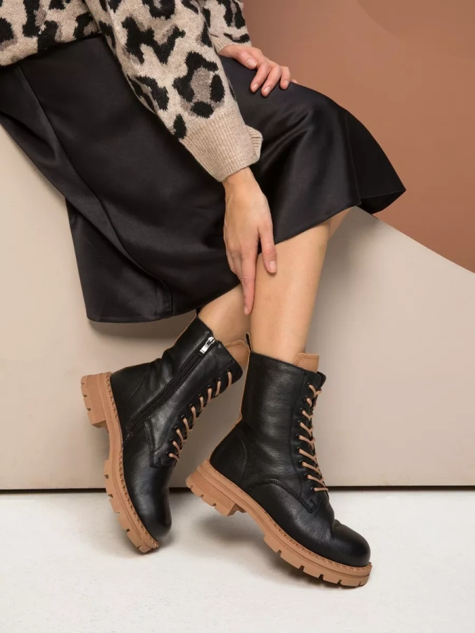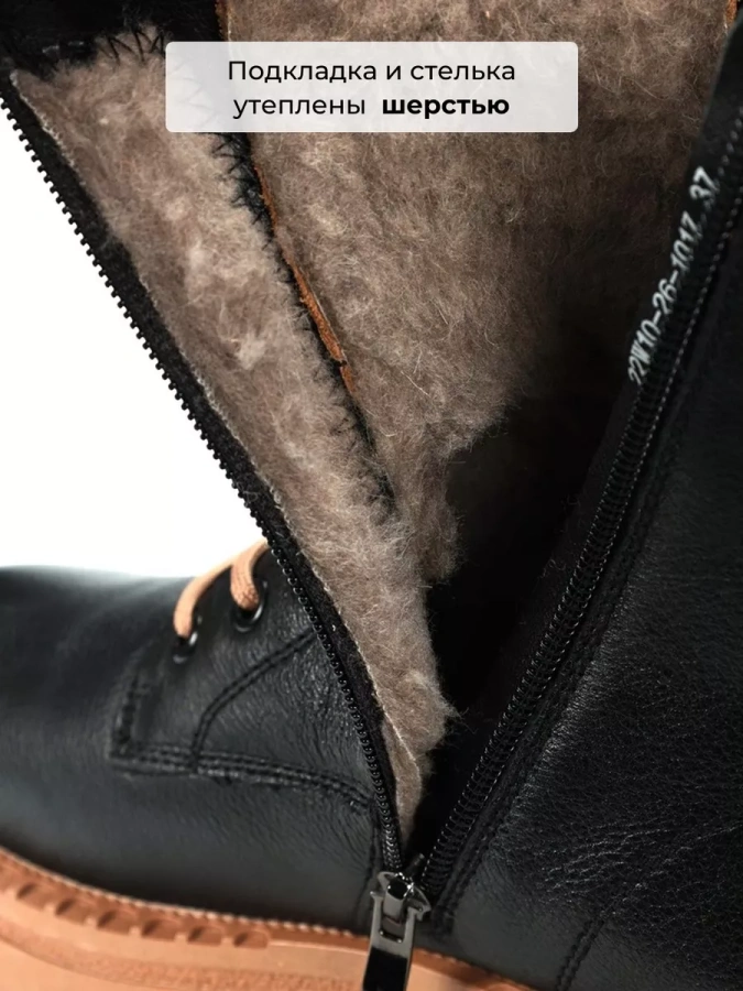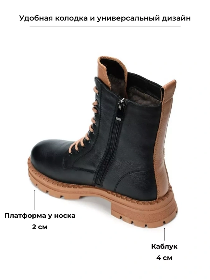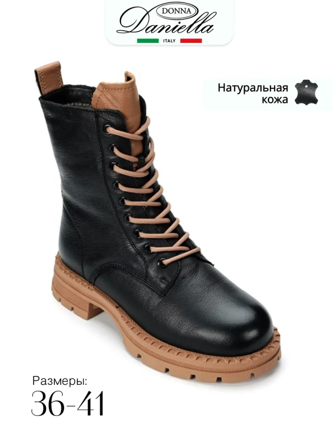 Женские зимние ботинки из натуральной кожи от итальянского бренда Donna Daniella. Длина стельки в см.: 36 - 23,5/ 37 - 24/ 38 - 24,5/ 39 - 25/ 40 - 25,5/ 41 - 26. Высота каблука - 4 см., высота подошвы в носочной части - 2 см., высота голенища - 18 см., обхват по верхнему краю голенища - 31 см. Утепленные шерстью подкладка и стелька отлично сохраняют тепло и придают максимальный комфорт. Идеально подойдут на холодную осень и зиму. Сочетание молнии и шнуровки облегчает процесс обувания и обеспечивает комфортную фиксацию на ноге. Сочетание светлой подошвы и черного верха придает модели уникальность. Молния с внутренней стороны оборудована защитным клапаном, который предотвращает защемления и зацепки одежды. Завышенная подошва с протектором обладает износостойкостью и хорошим сцеплением с поверхностью. Удобная колодка адаптирована под женскую стопу и длительную носку. Подходят на стандартную полноту стопы и небольшой +/-