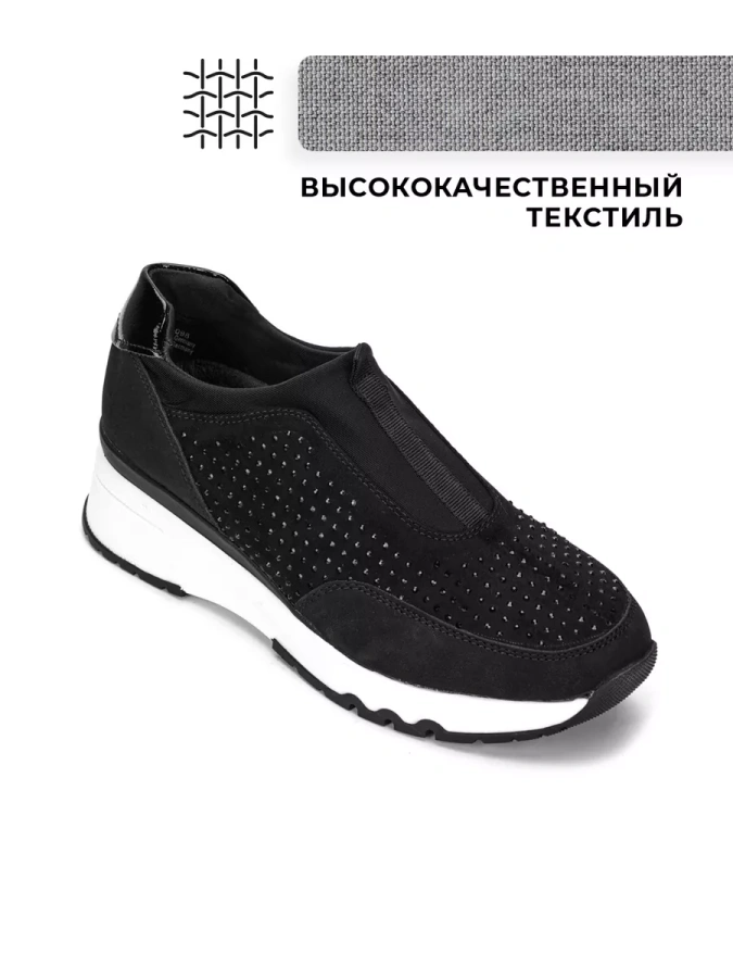 Кроссовки выполнены из качественного текстиля, что придает им дышащий характер и отличную посадку. Стелька из 100% натуральной кожи обеспечивает нежное прикосновение к Вашим ногам. С полимерной подошвой и танкеткой, высотой 5 см, Вы получите идеальное сочетание стиля и комфорта. Кроссовки не имеют застежки, поэтому их легко надевать и снимать, делая их отличным выбором для активного образа жизни. Подчеркните свой стиль с черными кроссовками и наслаждайтесь каждым шагом.