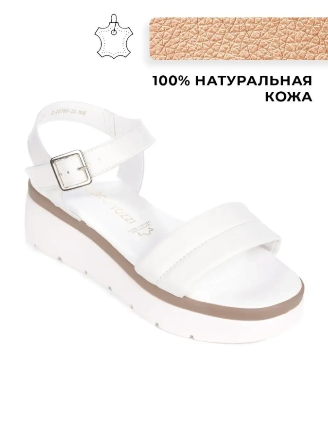 Женские босоножки из натуральной кожи от немецкого бренда Marco Tozzi. Длина стельки в см.: 36 - 23,5/ 37 - 24/ 38 - 24,5/ 39 - 25,5/ 40 - 26/ 41 - 26,5. Высота подошвы в пяточной части - 5 см., высота подошвы в носочной части - 2,5 см. Стелька выполнены из натуральной кожи, что повышает прочность изделия и придает максимальный комфорт ноге. Подошва на платформе обладает износостойкостью и хорошим сцеплением с поверхностью, что делает босоножки долговечными и практичными. Удобная колодка адаптирована под женскую стопу и длительную носку, а наличие удобной застежки с пряжкой на эластичной вставке обеспечивает комфортную фиксацию на ноге. Подходят на стандартную полноту стопы и небольшой +/-.