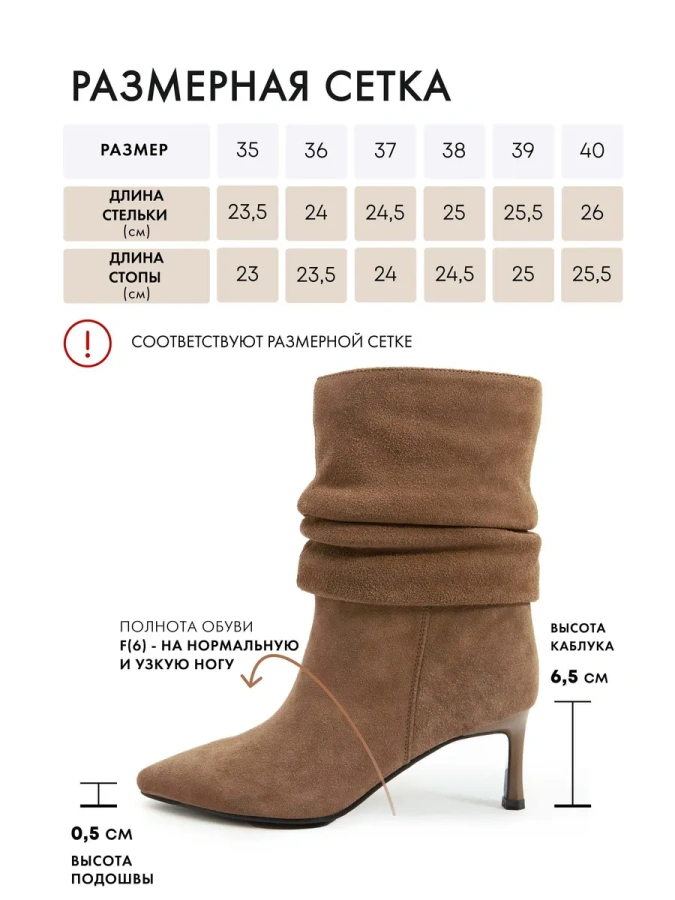 Изготовленные из 100% натуральной кожи (замши), они обеспечивают комфорт и долговечность. Высота каблука 6,5 см со шпилькой придаёт изящность и элегантность образу. Тёплая байковая подкладка и стелька создают уют и комфорт при носке. Полимерная подошва высотой 0,5 см обеспечивает удобство и лёгкость при ходьбе. Коричневый цвет универсален и легко сочетается с различными элементами гардероба. Эти полусапоги станут отличным дополнением к вашему осеннему образу.