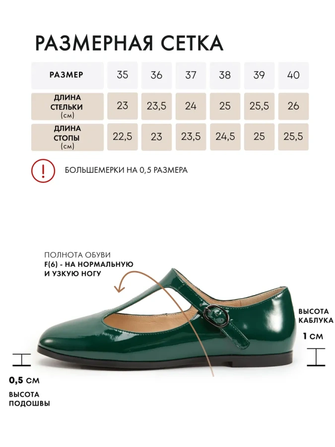 Длина стельки: 35р - 23,0см/ 36р - 23,5см/ 37р - 24,0см/ 38р - 25,0см/ 39р - 25,5см/40р - 26,0см. Полнота G (7) (на стандартную и увеличенную полноту).