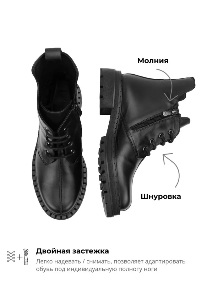Сочетание шнуровки и молнии позволяет легко и быстро обуваться, экономя Ваше время. Наша обувь изготовлена с особым вниманием к деталям, чтобы Вам было максимально комфортно в течение дня.