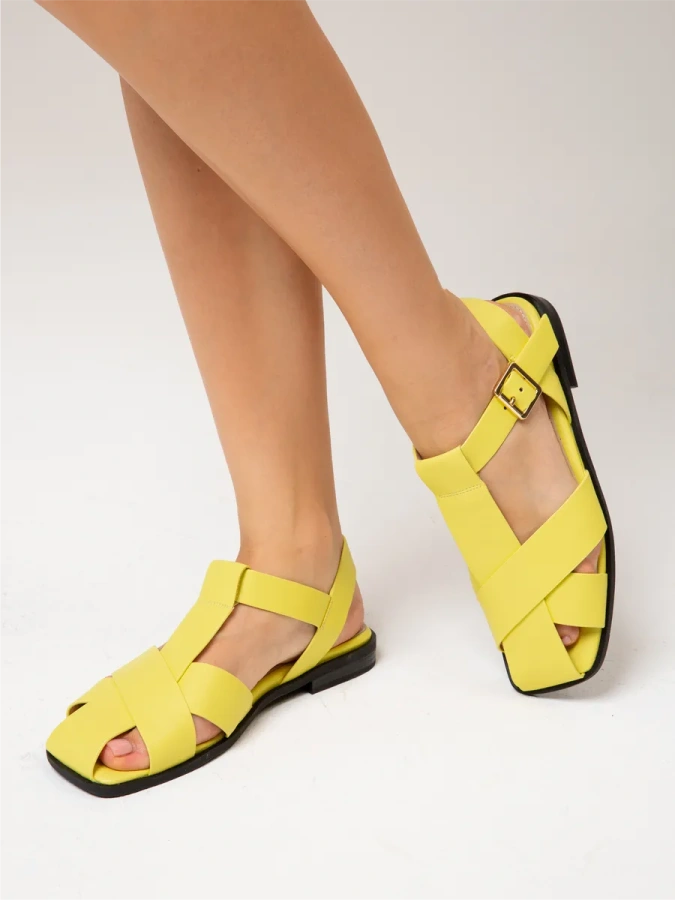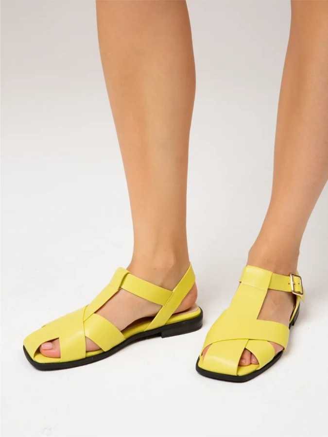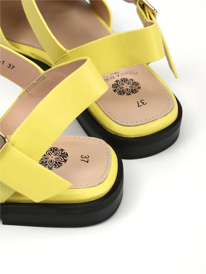 Модель выполнена из 100% натуральной кожи, что обеспечивает комфорт и долговечность. Венский каблук высотой 2,5 см и платформа в 1 см делают сандалии удобными и устойчивыми. Жёлтый цвет добавит яркости и позитива в ваш летний образ. Стильная пряжка и ремешок обеспечивают надёжную фиксацию на ноге. Лёгкая подошва из полимерного материала обеспечивает удобство при ходьбе. Сандалии идеально подойдут для создания повседневного образа.