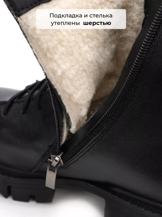 Основное преимущество обуви – материал. Верх ботинок изготовлен из 100% натуральной кожи, что гарантирует долгий срок службы и непревзойденное качество. А уют и тепло в холодную погоду обеспечивает шерсть как подкладка, так и стелька. Сзади в верхней части голенища молния растегивается увеличивая полноту.