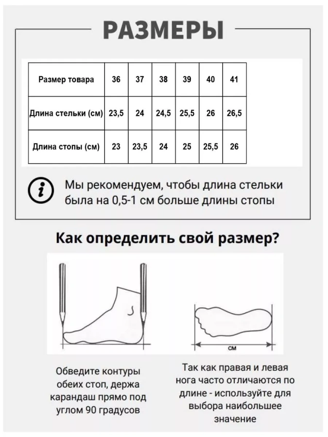 Длина стельки: 36р-23см/37р-23,5см/38р-24см/39р-24,5см/40р-25см/41р-26см Полнота G(7) стандарт