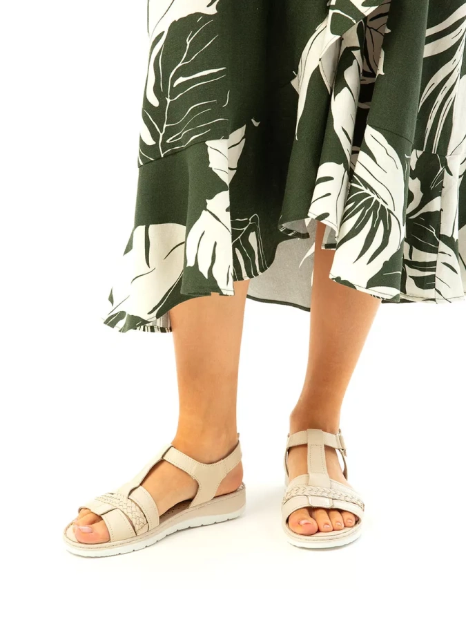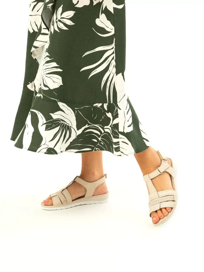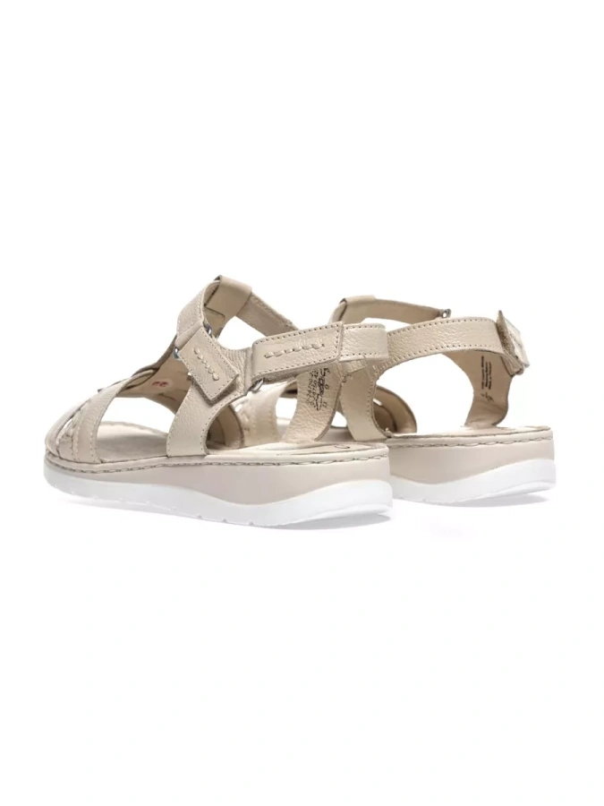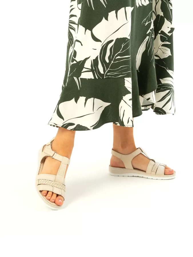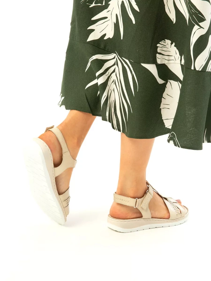Эти открытые босоножки выполнены из натуральной кожи, что повышает прочность изделия и придает максимальный комфорт ноге в летнюю жару. Изысканный бежевый оттенок создаст элегантный образ, который подчеркнёт вашу индивидуальность. Высота подошвы в 1 см и устойчивый каблук на танкетке высотой 3 см обеспечивают максимальный комфорт при ходьбе. Липучка-застёжка делает сандалии удобными в использовании, а также позволяет легко надевать и снимать их. Эти сандалии станут идеальным дополнением к вашему гардеробу, даря ощущение лёгкости и непринуждённости.