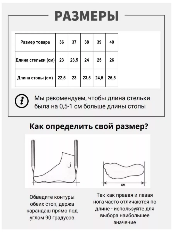 Длина стельки: 36р-23,5см/37р-24см/38р-24,5см/39р-25см/40р-25,5см Полнота G (7) стандарт