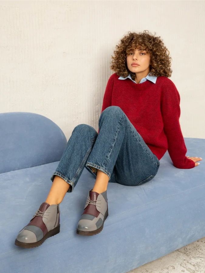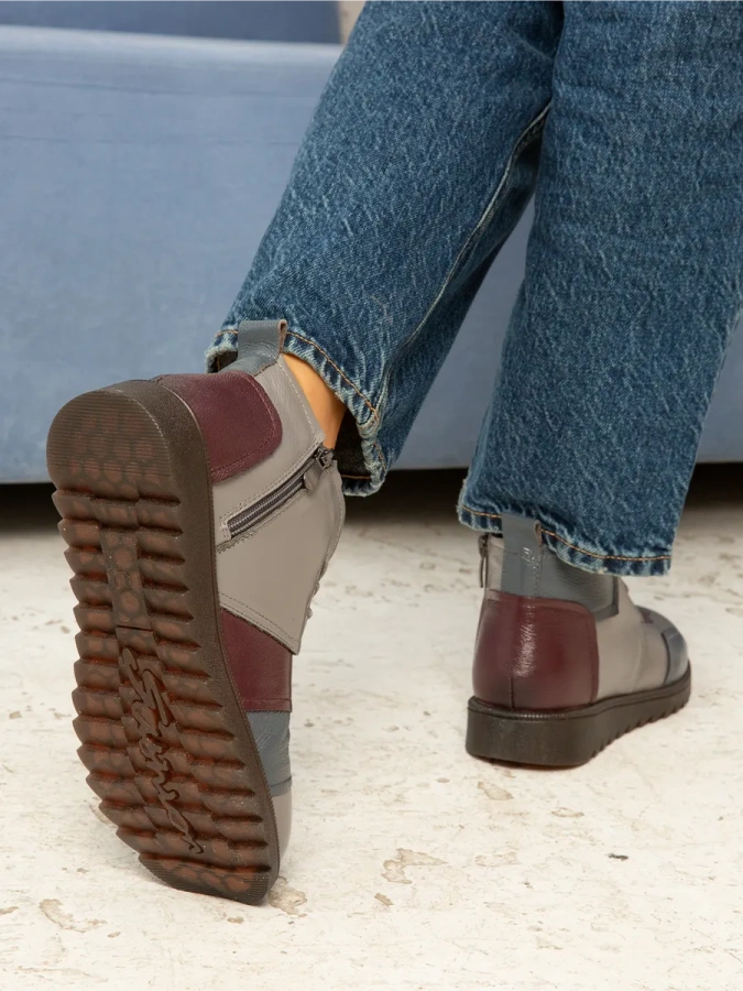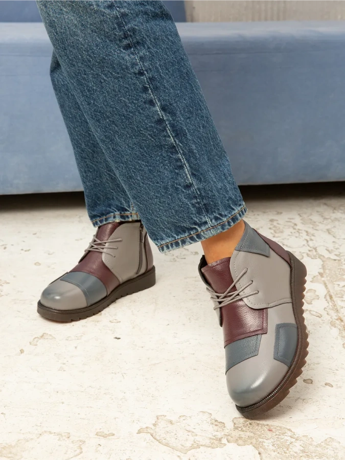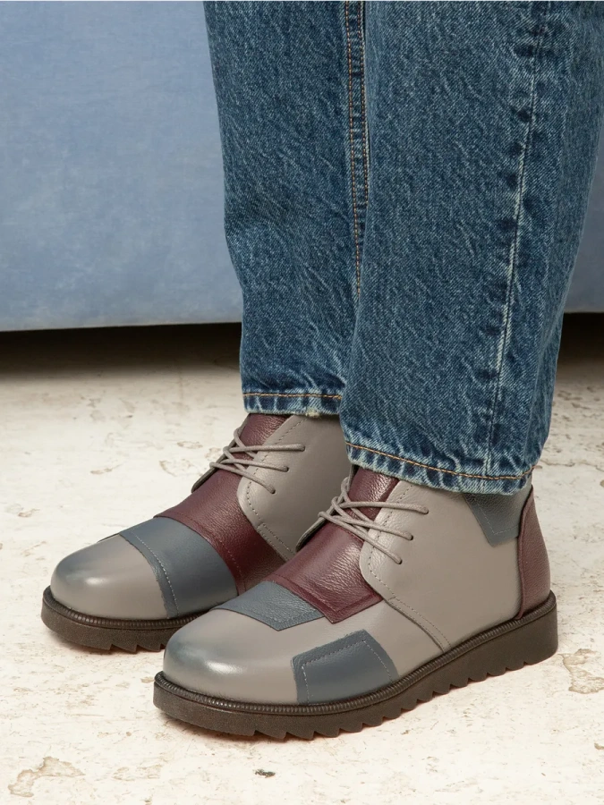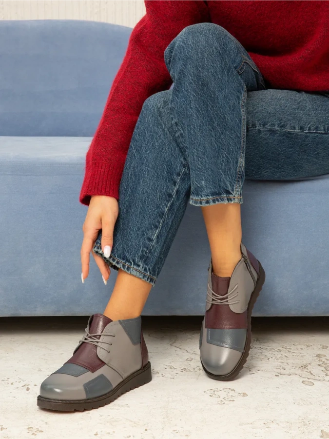 Модель изготовлена из 100% натуральной кожи, что обеспечивает её долговечность и привлекательный внешний вид. Серый цвет ботинок универсален и легко впишется в любой гардероб. Высота подошвы в 1,5 см и аккуратный каблук в 3 см делают модель удобной и стильной. Шнуровка и молния обеспечивают надёжную фиксацию и комфорт при ходьбе. Подкладка и стелька из байки сохраняют тепло в прохладную погоду.