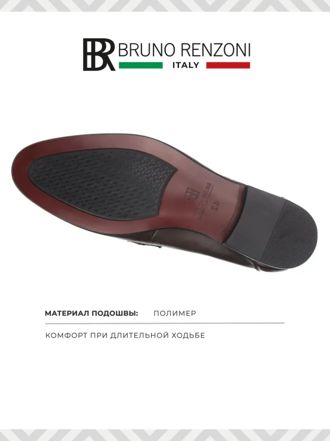 Мужские классические туфли Лоферы из натуральной кожи от итальянского бренда Bruno Renzoni. Длина стельки в см.: 38 - 26/ 39 - 26,5/ 40 - 27/ 41 - 27,5/ 42 - 28/ 43 - 28,5/ 44 - 29/ 45 - 29,5. Высота каблука - 2 см., высота подошвы в носочной части - 0,5 см., высота задника - 7 см. Подкладка и несъемная стелька также выполнены из натуральной кожи, что повышает прочность изделия и придает максимальный комфорт. Классическая подошва обладает износостойкостью и хорошим сцеплением с поверхностью. Универсальная модель, прекрасно подойдет на каждый день. Удобная колодка адаптирована под мужскую стопу и длительную носку. Подходят на стандартную полноту стопы и небольшой +/-