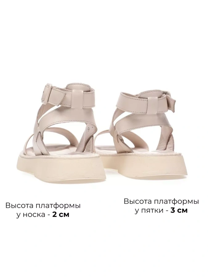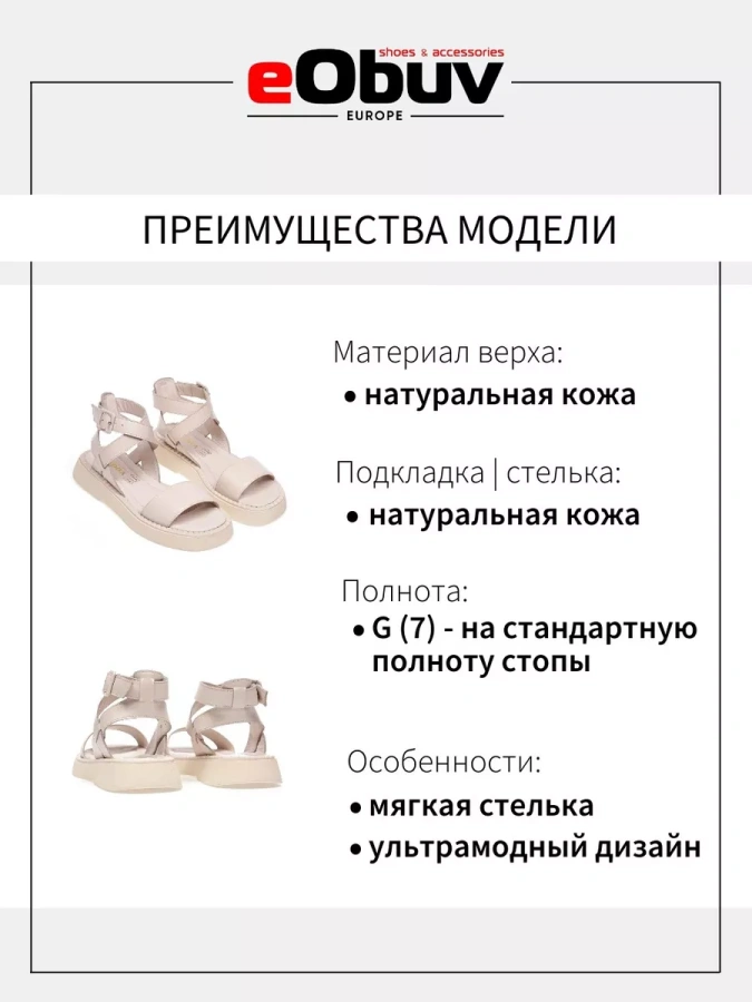 Женские сандалии из натуральной кожи от бренда eObuv. Длина стельки в см.: 36 - 23,5/ 37 - 24/ 38 - 24,5/ 39 - 25,5/ 40 - 26. Высота подошвы в пяточной части - 3 см., высота подошвы в носочной части - 2 см. Подкладка и стелька выполнены из натуральной кожи, что повышает прочность изделия и придает максимальный комфорт ноге в летний период.Подошва на платформе обладает износостойкостью и хорошим сцеплением с поверхностью, что делает сандалии долговечными и практичными. Удобная колодка адаптирована под женскую стопу и длительную носку, а ремешок на щиколотке обеспечивает комфортную фиксацию на ноге. Подходят на стандартную полноту стопы и небольшой +/-.
