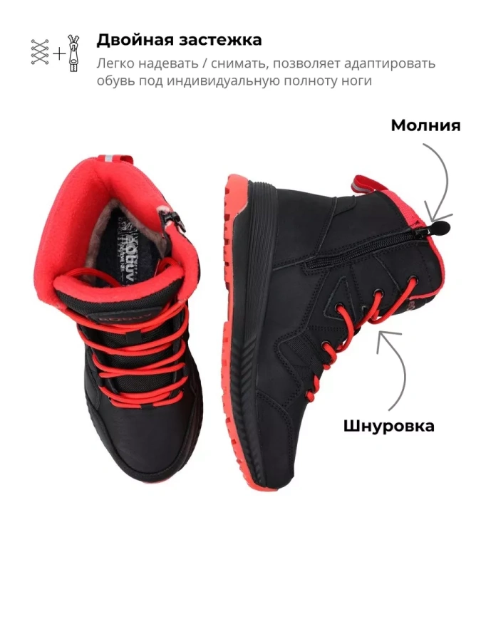 Подошва из ТЭП (термопластичная резина) обеспечивает отличное сцепление с поверхностью и устойчивость на скользких дорогах. Шнуровка и молния обеспечивают легкость надевания и снятия. Модель имеет увеличенную полноту H(8) и подойдет на широкую стопу.
