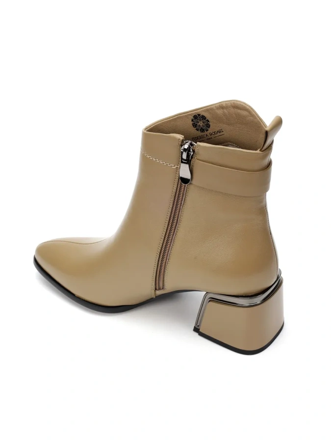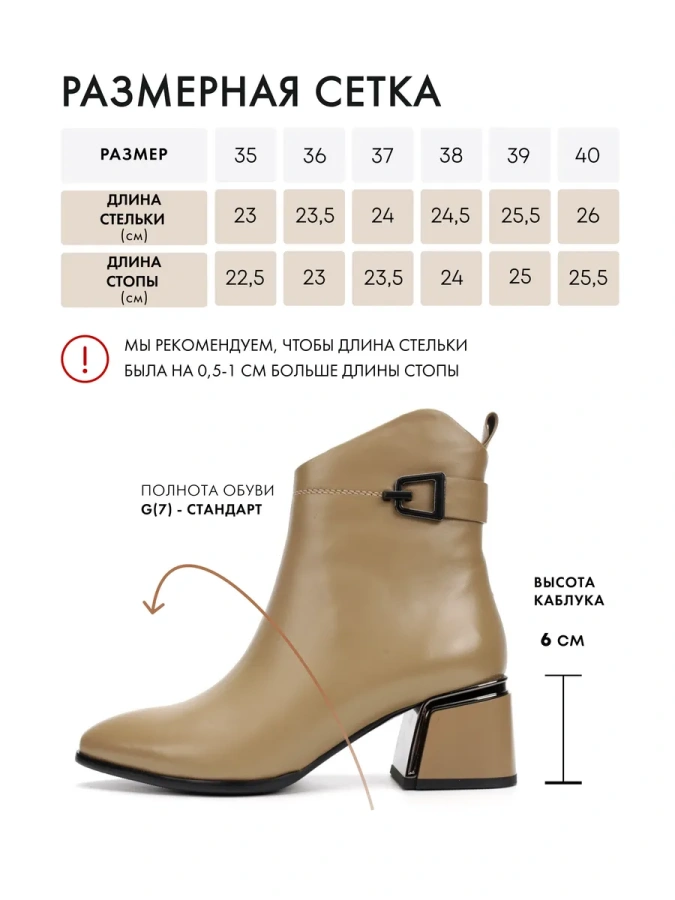 Трапециевидный каблук высотой 6 см добавляет женственности и элегантности образу, сохраняя при этом комфорт при ходьбе. Застежка на молнии обеспечивает легкость надевания и снятия ботильонов. Модель имеет полноту F(6) и подойдет на стандартную и более узкую стопу.