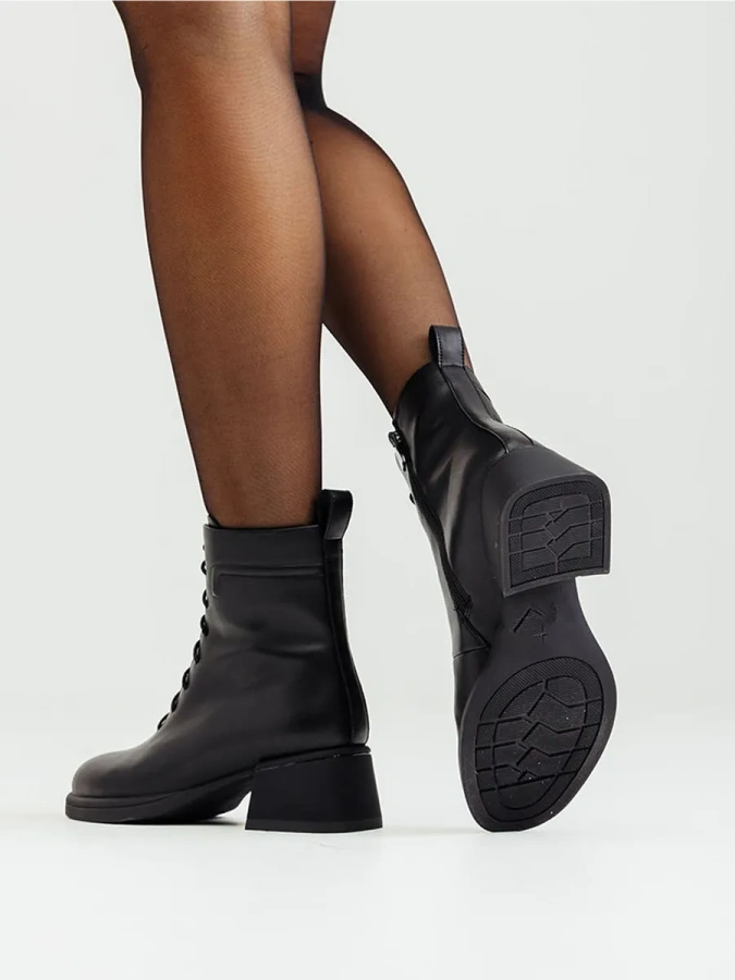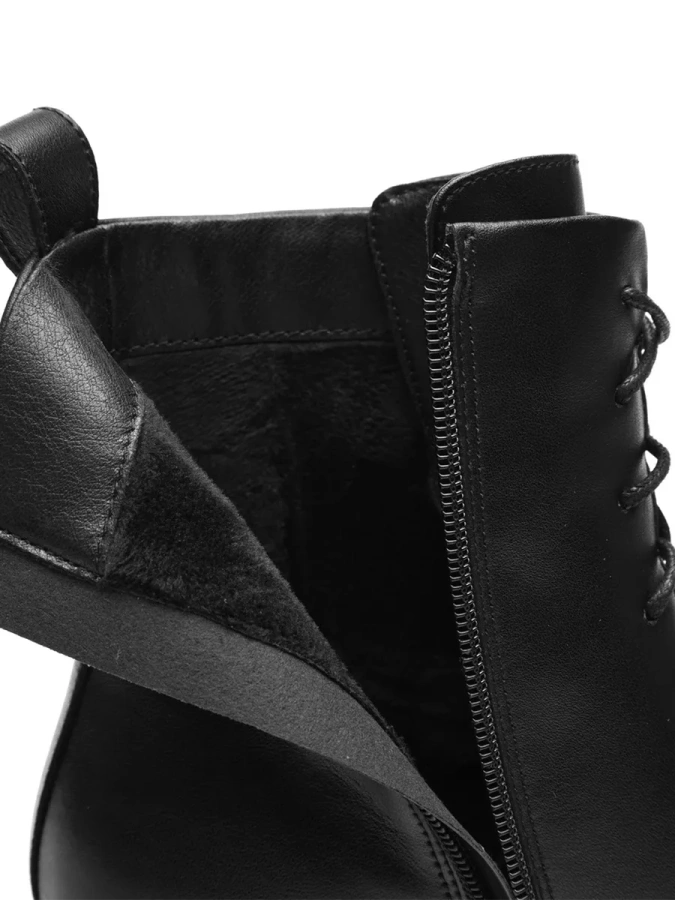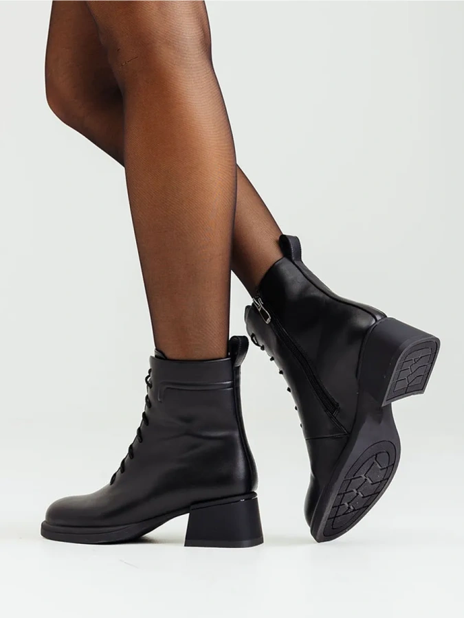 Эта универсальная модель прекрасно сидит на ноге и отлично сочетается практически с любым видом верхней одежды. Классическая подошва обладает износостойкостью и хорошим сцеплением с поверхностью. Особое внимание производитель уделяет различным деталям, придающим обуви особую роскошь и удобство использования. Ботинки оснащены молнией, оборудованной защитным клапаном с внутренней стороны, который предотвращает защемления и зацепки одежды. Сочетание молнии и шнуровки облегчает процесс обувания. Шнуровка позволяет регулировать степень посадки на ноге. Это означает, что каждая девушка сможет найти свой оптимальный размер и достичь максимального комфорта. Ботильоны имеют утепленную байкой подкладку, которая отлично сохраняет тепло. Ботинки на байке смотрятся очень стильно и гармонично закончат любой образ. Хорошо подойдут на осень-весну и на не очень холодную (европейскую) зиму. Ботинки классика кожа оснащены также стелькой на байке, что повышает теплоизоляционные свойства и придаёт max комфорт.