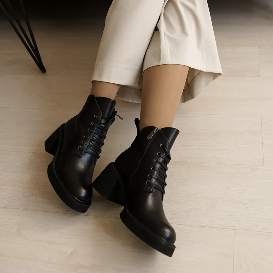 Ботинки оснащены шнуровкой и молнией, что делает надевание и снятие удобными и практичными. Черный цвет придает им классический и универсальный вид, который легко сочетается с различными нарядами.