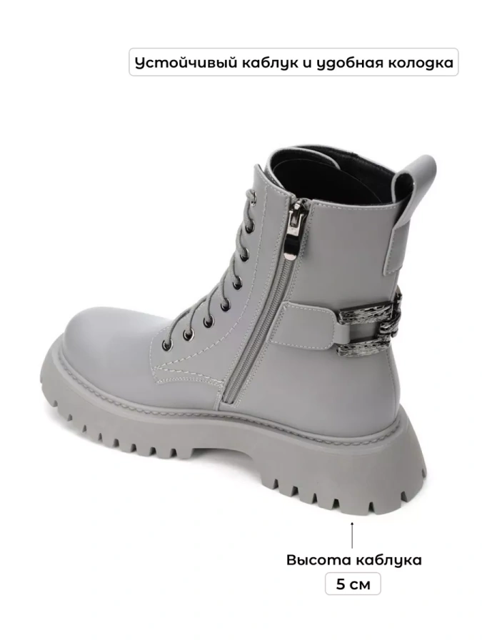 Прямоугольный каблук высотой 5 см придает берцам женственность и стиль, а низкая подошва с высотой 3,5 см добавляет комфорта при ходьбе.