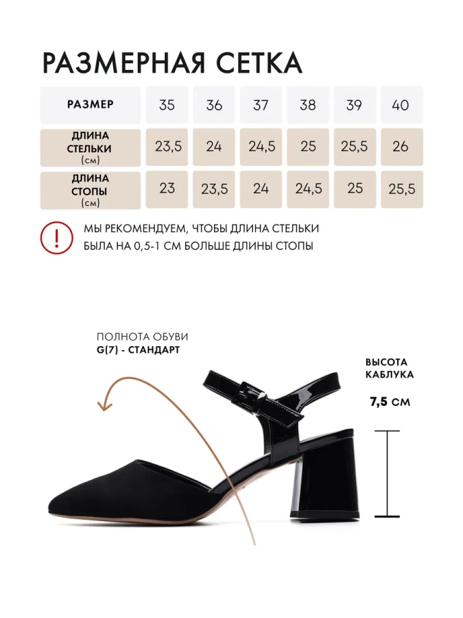 Длина стельки: 35р - 23,5см/ 36р - 24,0см/ 37р - 24,5см/ 38р - 25,0см/ 39р - 25,5см/40р - 26,0см. Полнота F(6) (на узкую полноту стопы).