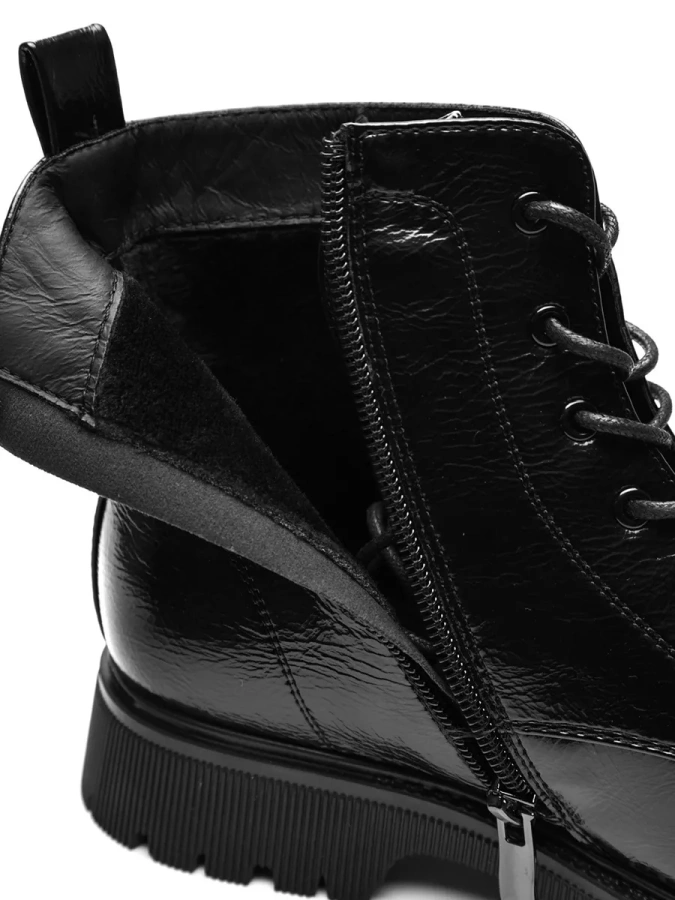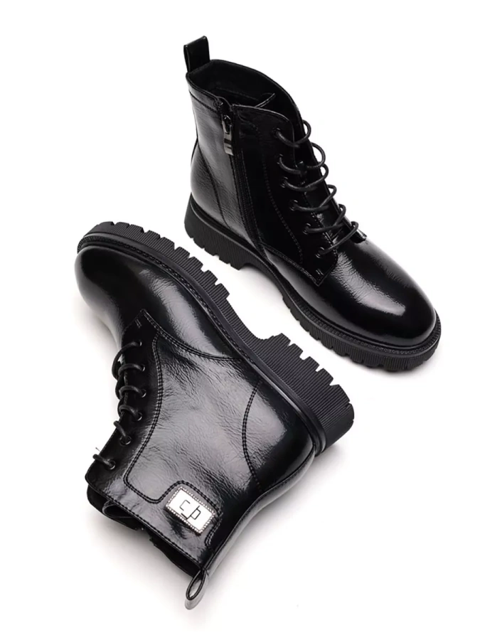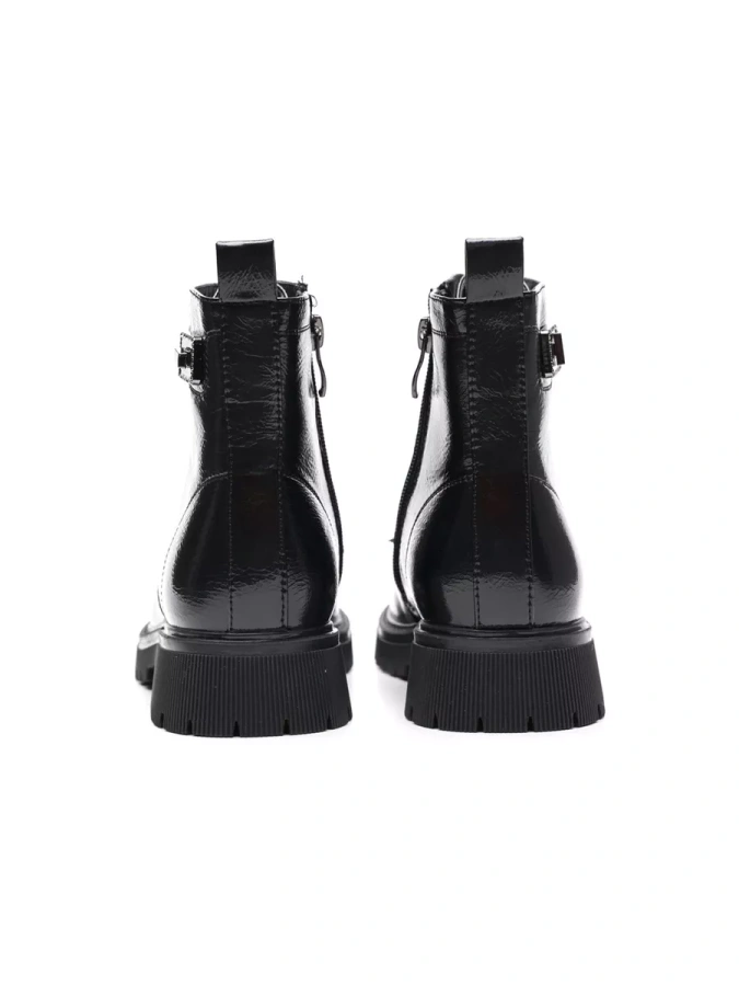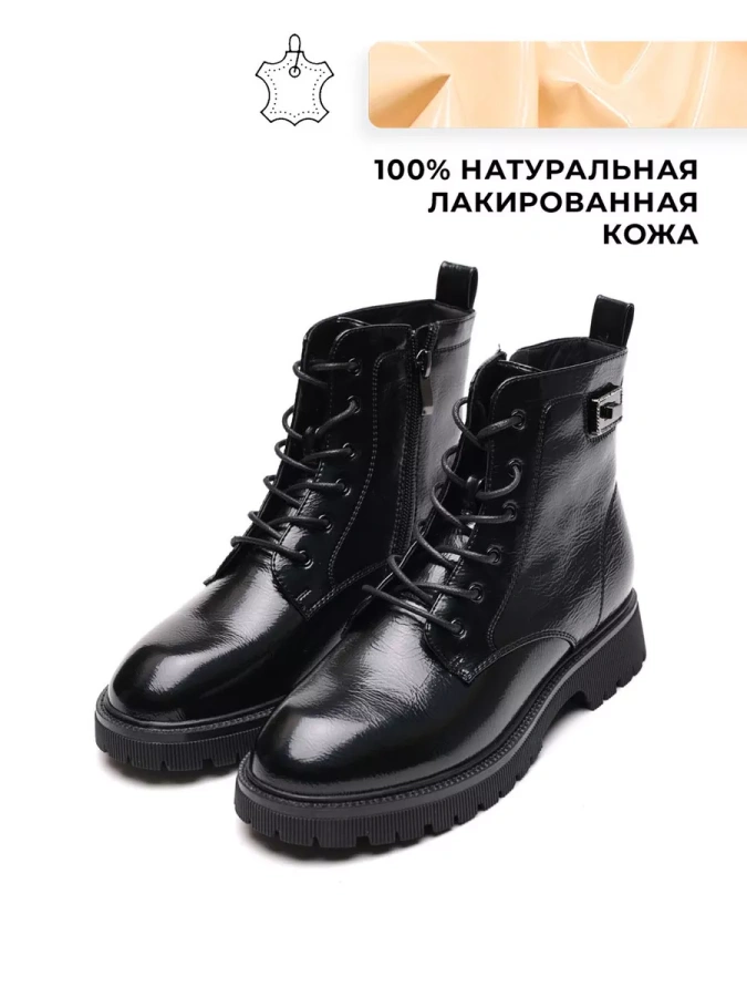 Ботинки изготовлены из 100% натуральной лаковой кожи, что гарантирует их высокое качество и долговечность. Чёрный цвет универсален и легко сочетается с любыми элементами гардероба. Высота подошвы составляет 2 см, а каблука — 3,7 см, обеспечивая комфорт при ходьбе. Кирпичный каблук придаёт ботинкам особый шарм. Благодаря подкладке и стельке из байковой ткани, ноги остаются в тепле и комфорте даже в холодное время года. Резиновая подошва обеспечивает отличную износостойкость. Удобная шнуровка и молния делают эти ботинки не только практичными, но и стильным дополнением к вашему образу. Они идеально подходят для создания повседневных образов в стиле кэжуал.