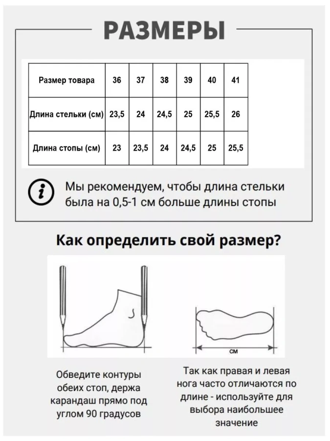 Длина стельки: 36р - 23,5см/ 37р - 24,0см/ 38р - 24,5см/ 39р - 25,0см/40р - 25,5см/41р - 26,0см. Полнота F(6) (на узкую полноту стопы).