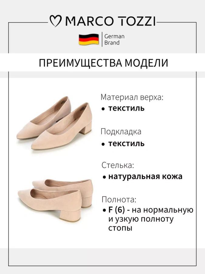 Носите их с легкими повседневными нарядами или офисными образами для завершения стиля. MARCO TOZZI создает туфли, которые сочетают в себе немецкое качество и стиль, подчеркивая Вашу утонченность в каждом шаге.