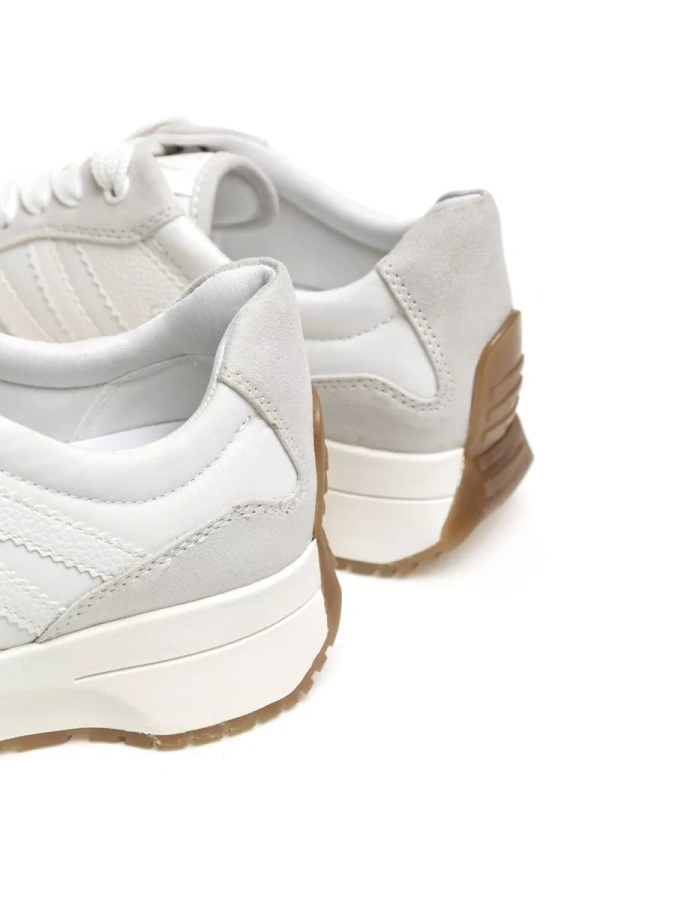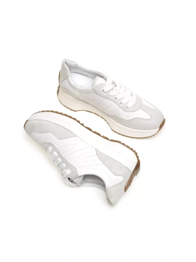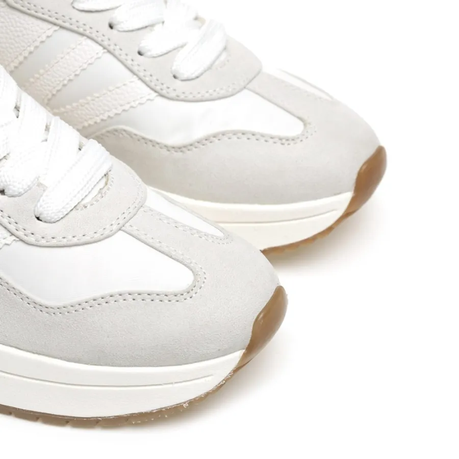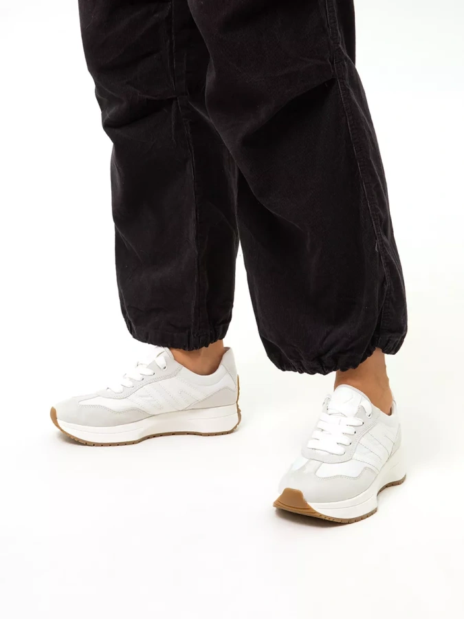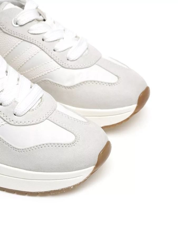 Искусственная замша, из которой сделан верх кроссовок, придаёт им изысканный вид. Текстильная подкладка и стелька обеспечивают комфорт при носке. Высота подошвы — 2 см, а высота каблука — 4,5 см на танкетке — делает кроссовки удобными и практичными для повседневного использования в любое время года.