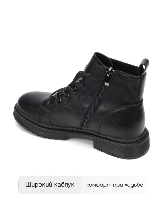 Ботинки оснащены полимерной подошвой с платформой высотой 2 см и прямоугольным каблуком высотой 3 см, что обеспечивает стабильность и уверенность при ходьбе. Застежка на молнии с резинкой и фиксатором облегчает процесс надевания и снятия обуви. Модель имеет полноту F(6) и подойдет на стандартную и более узкую стопу.