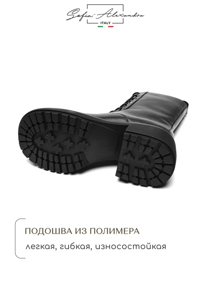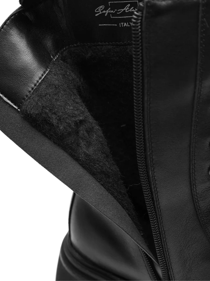 Берцы SOFIA-ALEXANDRA — это идеальный выбор для тех, кто ценит комфорт и стиль в холодное время года. Изготовленные в Италии из 100% натуральной кожи, они отличаются высоким качеством и долговечностью. Чёрный цвет и лаконичный дизайн в стиле casual делают эти берцы универсальными для любого образа. Шерстяная подкладка и стелька обеспечивают тепло и комфорт, а полимерная подошва с высотой 2,5 см и каблуком 6,5 см (вид каблука — «кирпич») придаёт обуви устойчивость и удобство.